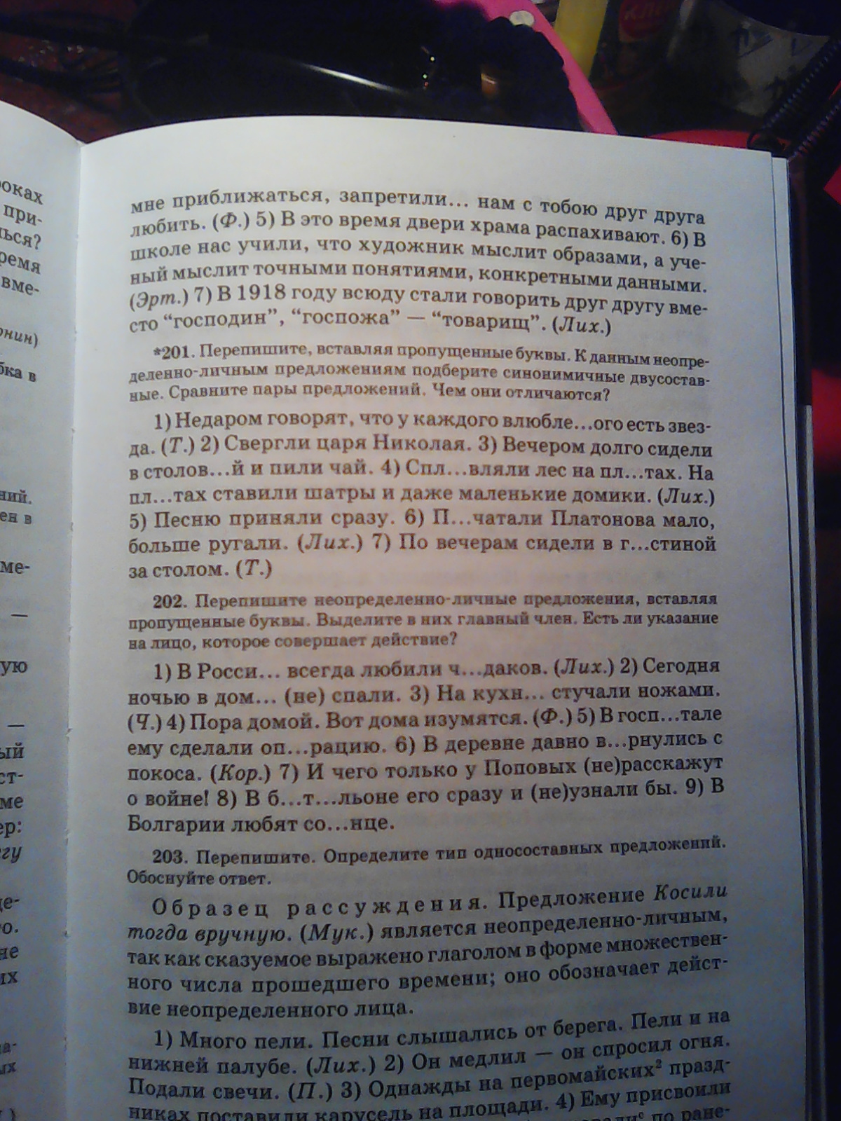 1) Недаром говорят, что у каждого влюблённого есть звезда. 2) Свергли царя Николая (неопр.-личное). - Они свергли царя Николая (двусост.). 3) Вечером долго сидели в столовой и пили чай (неопр.-личное). - Вечером мы долго сидели в столовой и пили чай (двусост.). 4) Сплавляли лес на плотах (неопр.-личное). - Они сплавляли лес на плотах (двусост.). На плотах ставили шатры и даже маленькие домики (неопр.-личное). - На плотах они ставили шатры и даже маленькие домики (двусост.). 5) Песню приняли сразу (неопр.-личное). - Они приняли песню сразу (двусост.). 6) Печатали Платонова мало, больше ругали (неопр.-личное). - Они печатали Платонова мало, больше ругали (двусост.). 7) По вечерам сидели в гостиной за столом (неопр.-личное). - По вечерам мы сидели в гостиной за столом (двусост.).