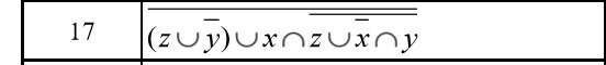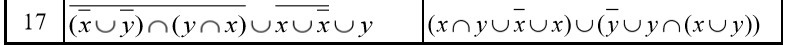 displaystyle 17.1. quad overline{(overline x+overline y)yx}+overline{x+overline x}+y=overline{0+0}+overline 1+y=1+0+y=1 \ 17.2. quad (xy+overline x+x)+(overline y+y(x+y))=(xy+1)+(overline y+xy+y)= \ 1+(1+xy)=1+1=1