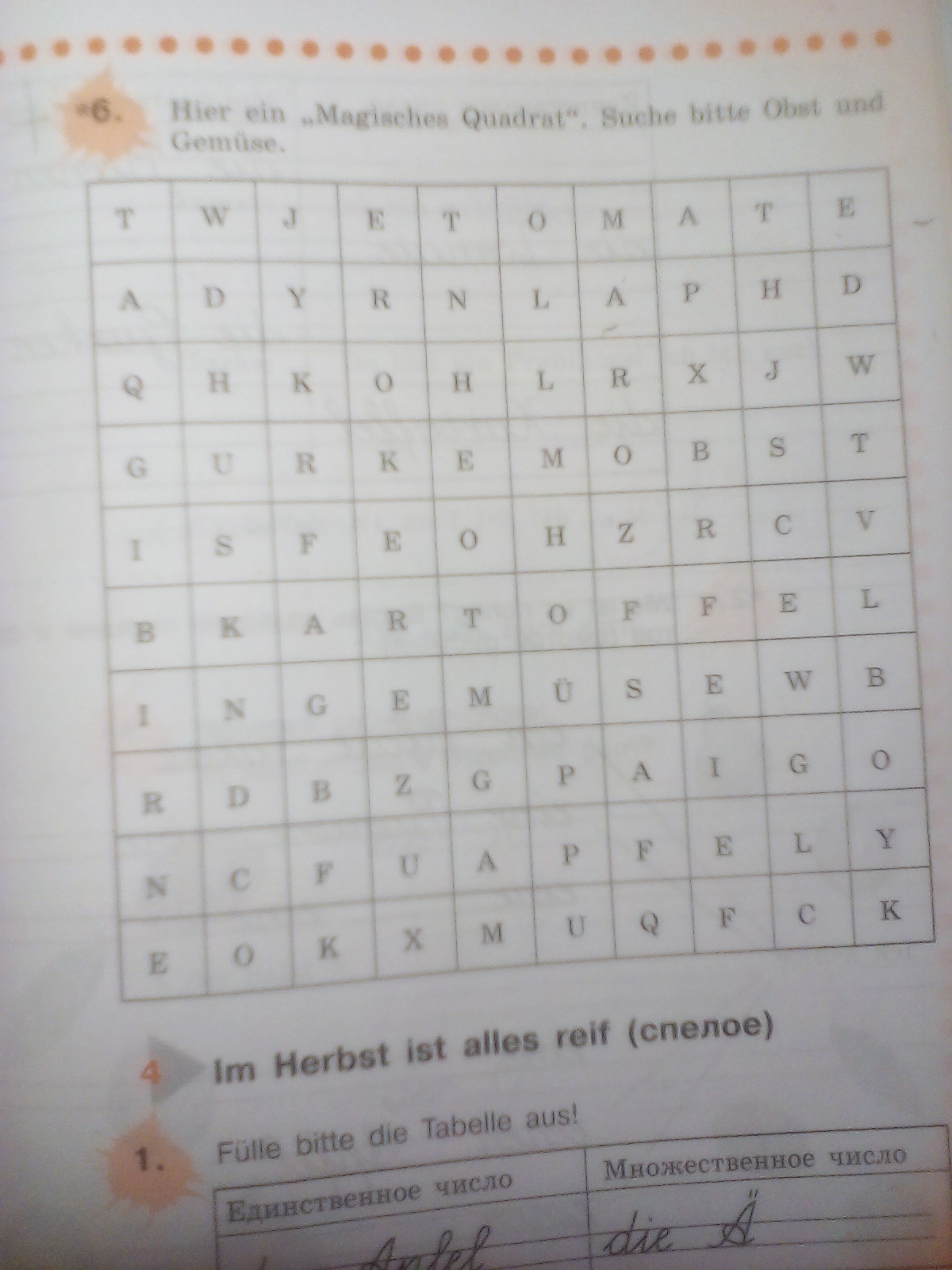 Birne(левый нижний), Tomate(верхни правый), Apfel(нижний правый),Gurke(четвёртая строчка сверху слева), Kartoffel(6 строчка сверху), Gemüse(7 строчка сверху), Obst(4 строчка сверху справа)