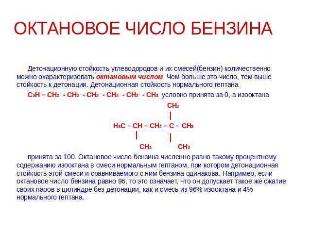 ОКТАНОВОЕ ЧИСЛО – мера детонационной стойкости бензинаи моторных масел. Во всем мире производится и потребляется огромное количество бензина – как автомобильное топливо. Чтобы бензин сгорал в цилиндрах автомобиля «правильно», он должен обладать рядом свойств. Одно из важнейших – октановое число.