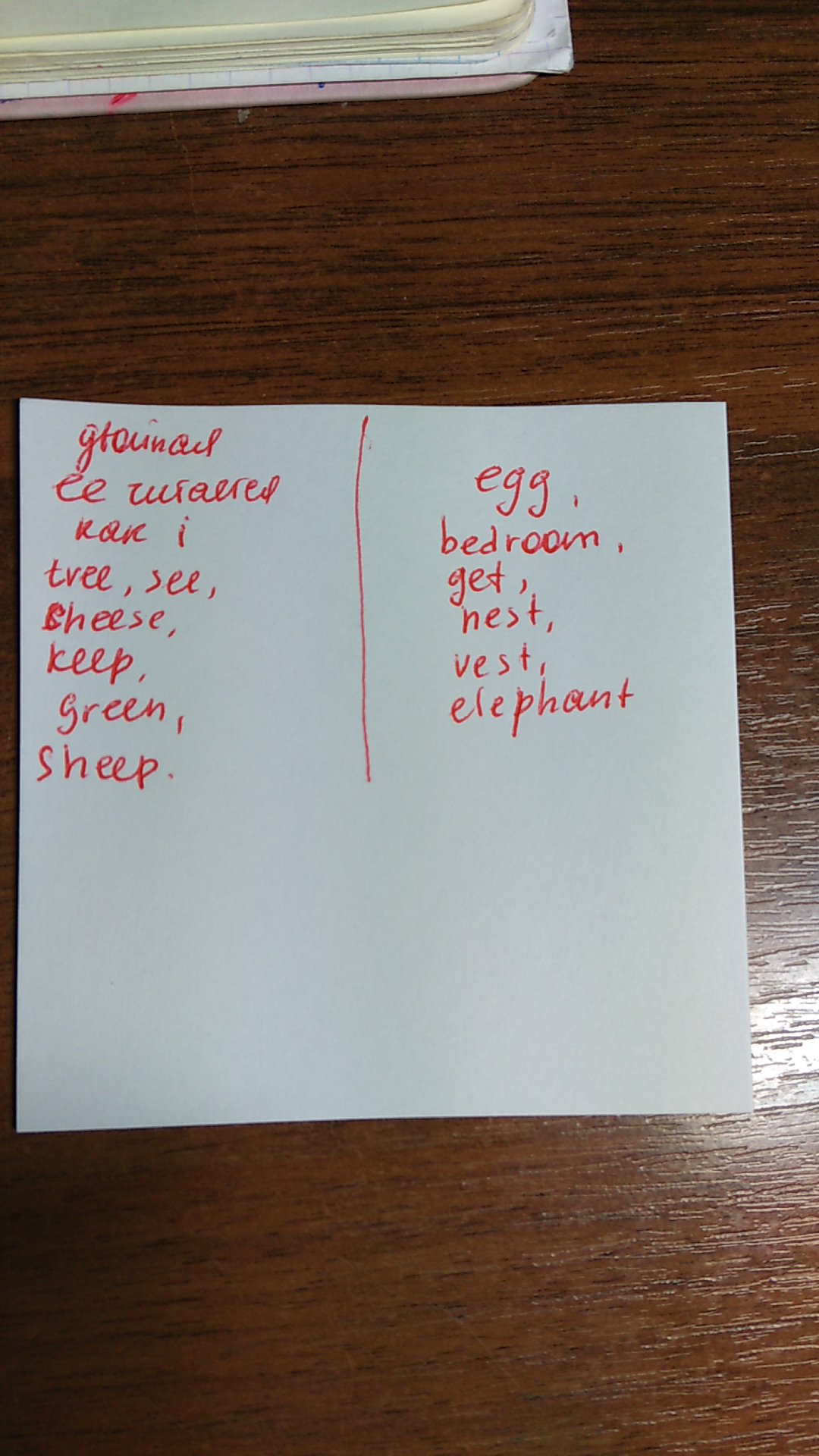 распредели слова по столбикам в зависимости от правил чтения подчеркнутых букв прочти слова Tree see egg cheese bedroom qet keep nest green vest sheep elephant
