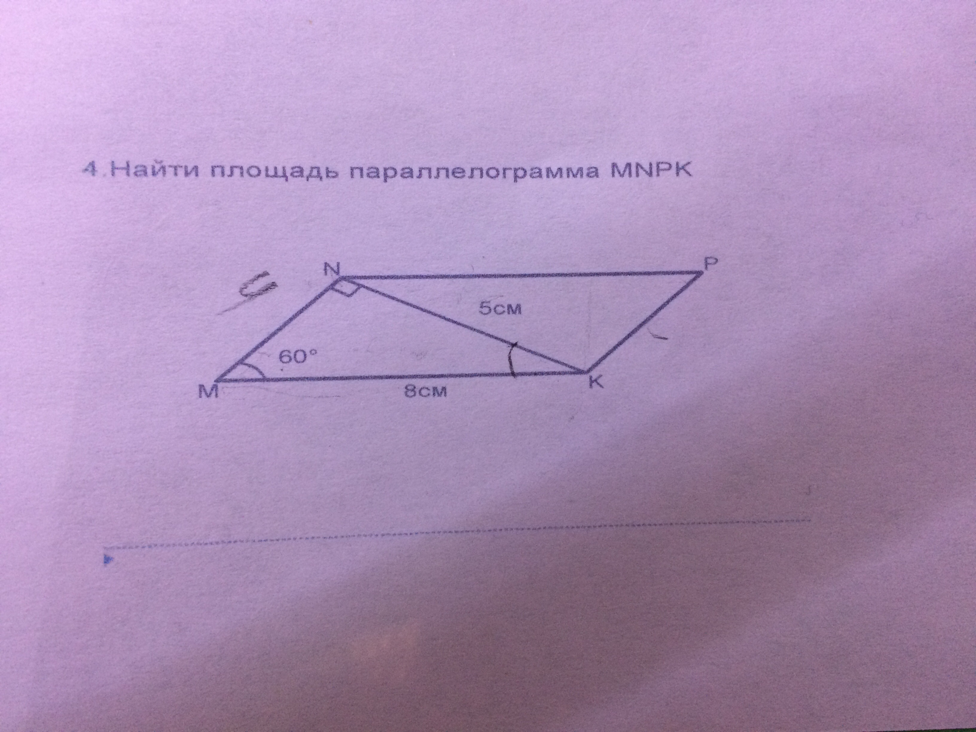 Площадь параллелограмма =NK умножить на MK=4 умножить на 8 = 32 сантиметра в квадрате