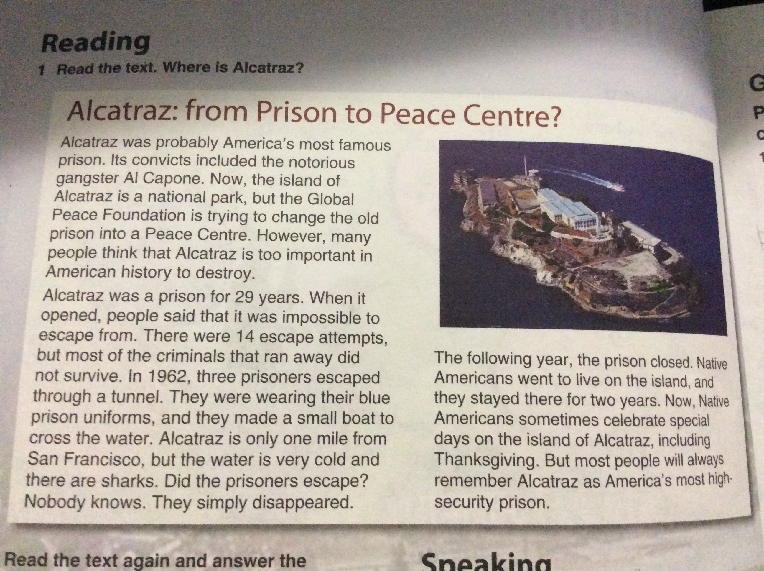 2) 1. It was Al Capone. 2.It's trying to change the old prison into a Peace Centre. 3. It were 14 escape attemts. 4. Three prisoners escaped through a tonnel. 5. I think they didn't survive because of cold water and sharks. 6. No, they aren't live on an island now. А третье - там слушать надо.