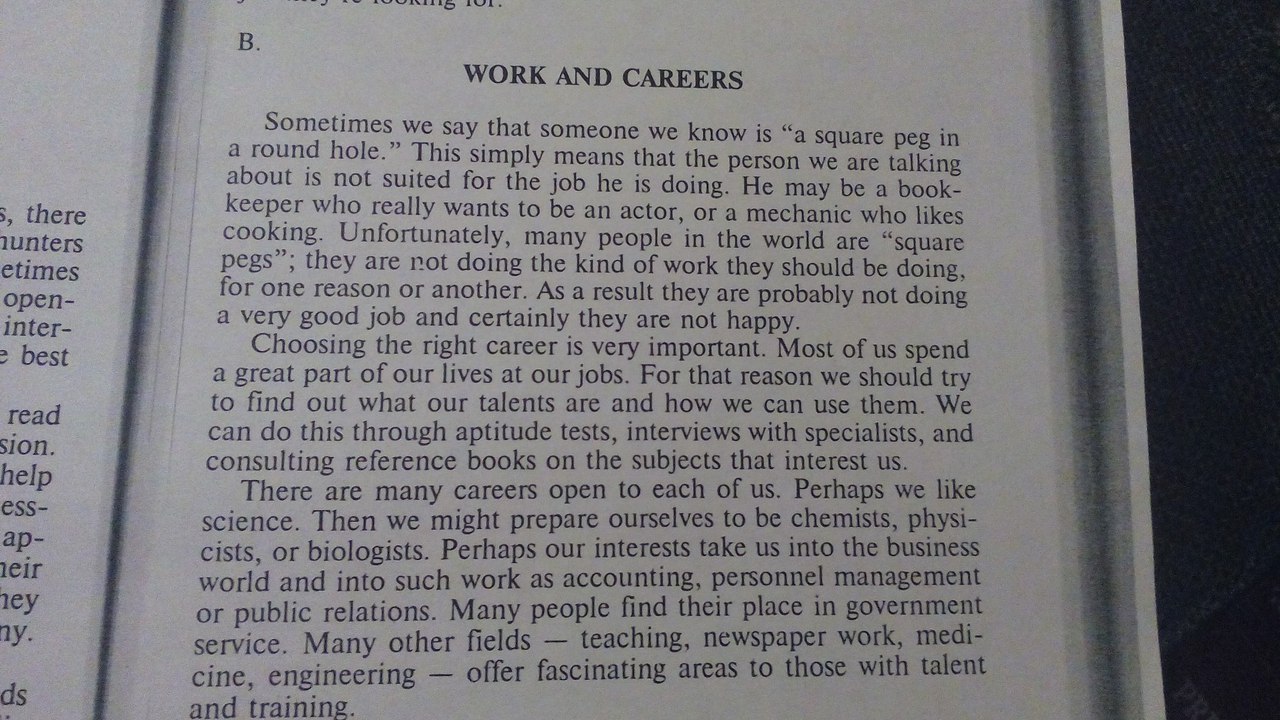 У нас есть богатый выбор профессий. Допустим, мы увлекаемся наукой. Значит мы должны приготовиться стать химиками, физиками или биологами. Допустим, наши интересы связаны с миром бизнеса и такой работой, как бухгалтерия, менеджмент или публичные отношения. Много людей находят себя в правительстве. Много других сфер деятельности - учительство, журналистика, медицина, инженерия - позволяют быть довольным своей работой тем, у кого есть желание и талант.
