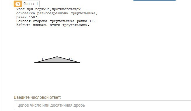 2.Угол при вершине, противолежащий основанию равнобедренного треугольника, равен 150 градусам. Боковая сторона равна 10.Найдите площадь этого треугольника.