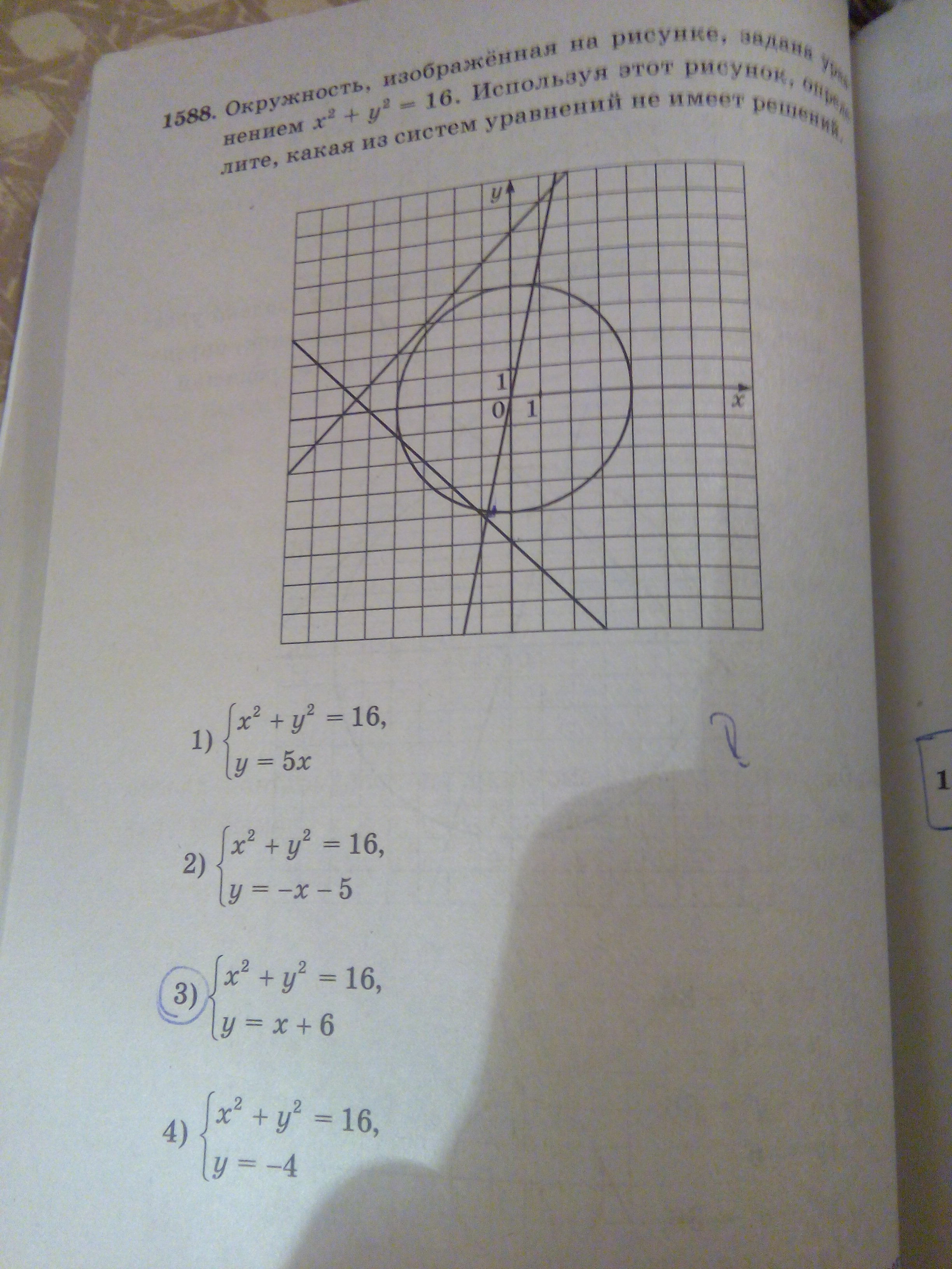 Тк прямая, заданная функцией у=х+6 не пересекается с окружностью, определяемой уравнением х^2+у^2=16, значит у них нет общих точек, координаты которых обращают в верные равенства оба уравнения, поэтому система этих уравнений решений не имеет.