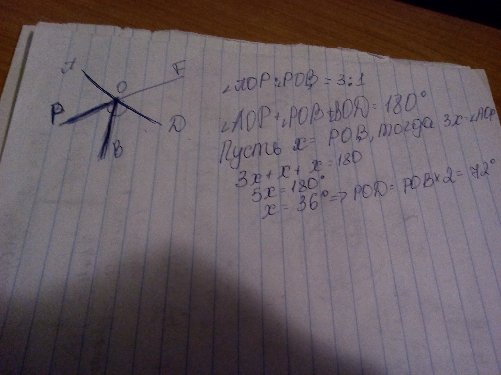 Прямі АD і PF перетинаються в точци О ! ОВ- бісектриса кута РОD ! Знайдіть міру кута РОD якщо кут АОР : кут РОВ = 3:1