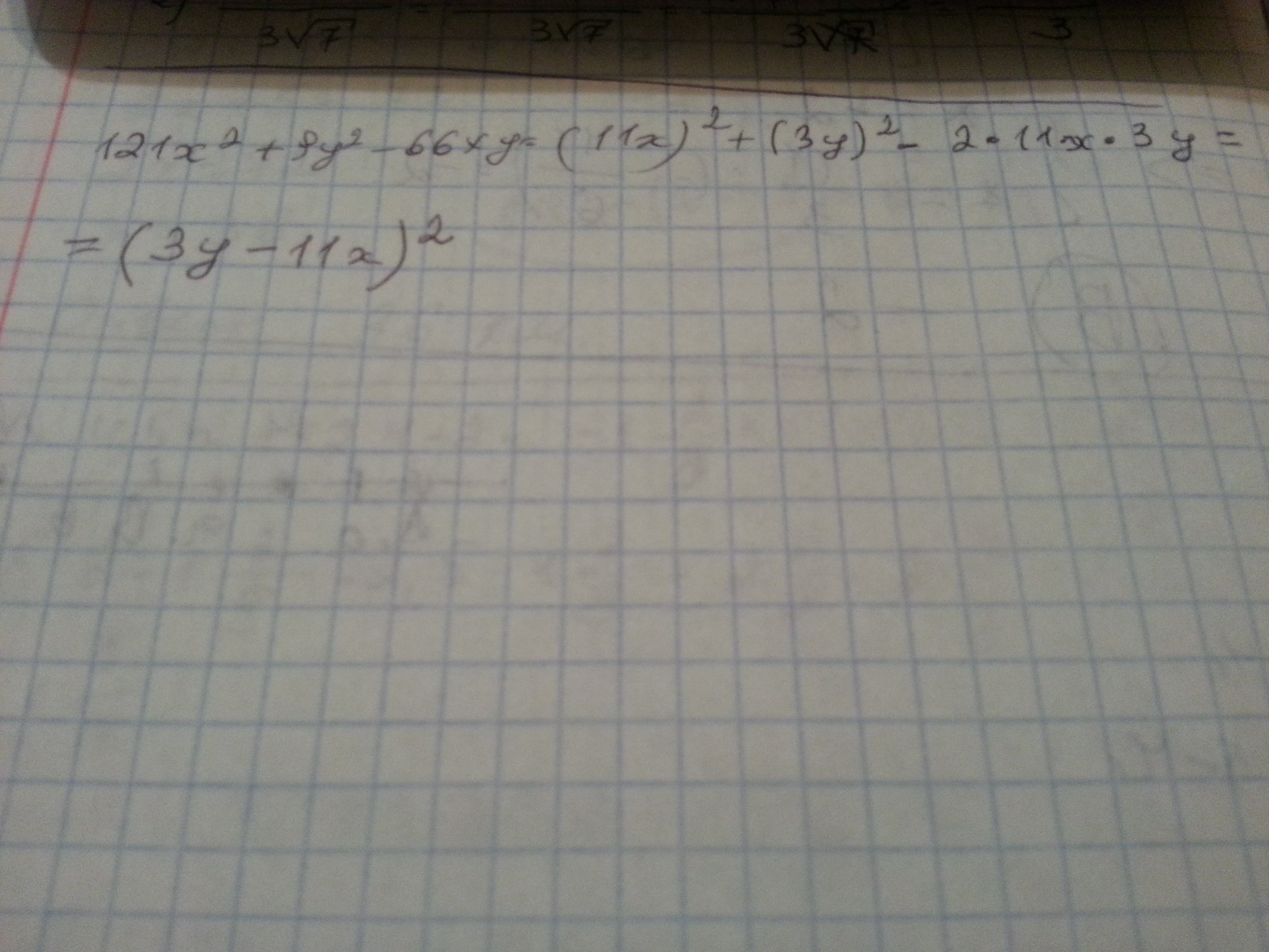 =121х^2-66ху+9у^2=(11х-3у)^2
