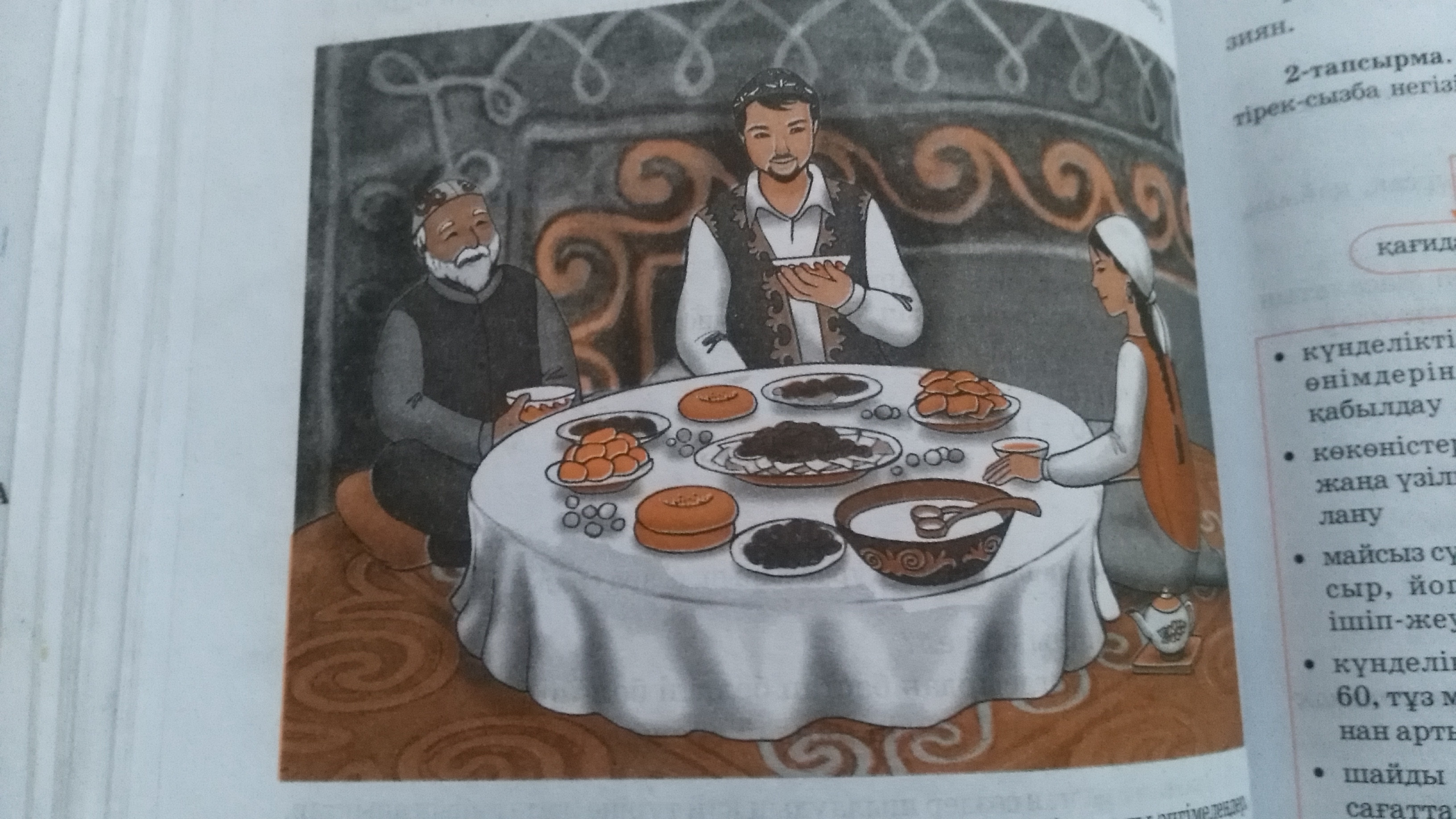 Атам, әкем, анам әрдайым дастархан басында бірге отырып ас ішеді. Дастарханға анам ұлттық тағамдарды қояды. Барлық тағамдарды өзі дайындайды. Қазы-қарта, құрт, ірмішік. Нанды өзі жабады, бауырсақ пісіреді. Өздеріңіз көріп отырғандай ағаштан жасалған ыдыс, қасықтарды қолданады. Бешбармақ, қуырдақ бәрін дәмді әзірлейді. Жаңа сауылған саумал денсаулыққа пайдалы дейді.
