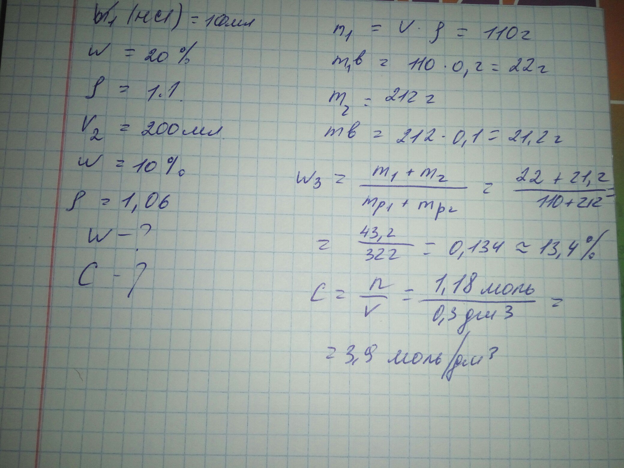 смешали 100 мл 20% раствора (плотность равна 1,1 г/мл) и 200 мл 10% раствора соляной кислоты (плотность равна 1,06 г/мл). Вычислить массовую долю и молярную концентрацию полученного раствора соляной кислоты.