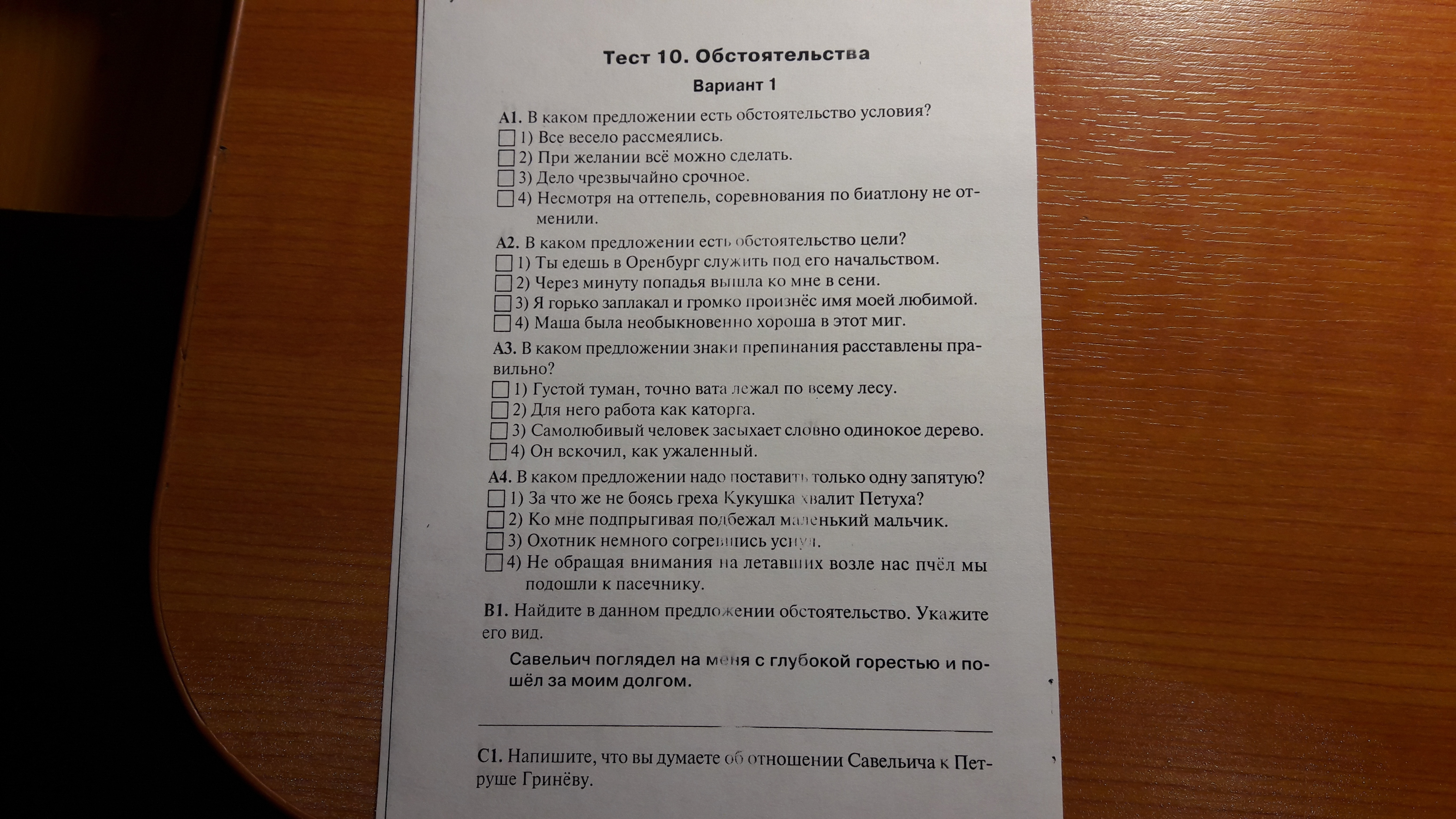 А1.-2) А2.-1) А3.-2) А4.-4) В1.-посмотрел-(куда?)-на меня-обстоятельство места. посмотрел на меня-(как?)-с глубокой горестью-обстоятельство образа действия пошёл-(куда?)-за моим долгом-обстоятельство места. С1.-покровительственное,как к барину,но Савельич всё-таки подчиняется Гринёву.