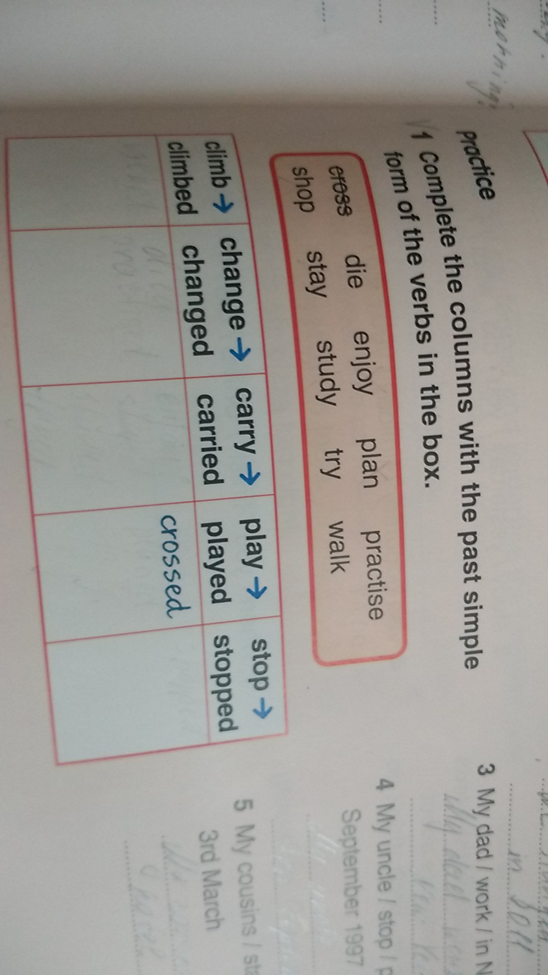 died, enjoyed, planned, practiced, shopped, stayed, studied, tried, walked