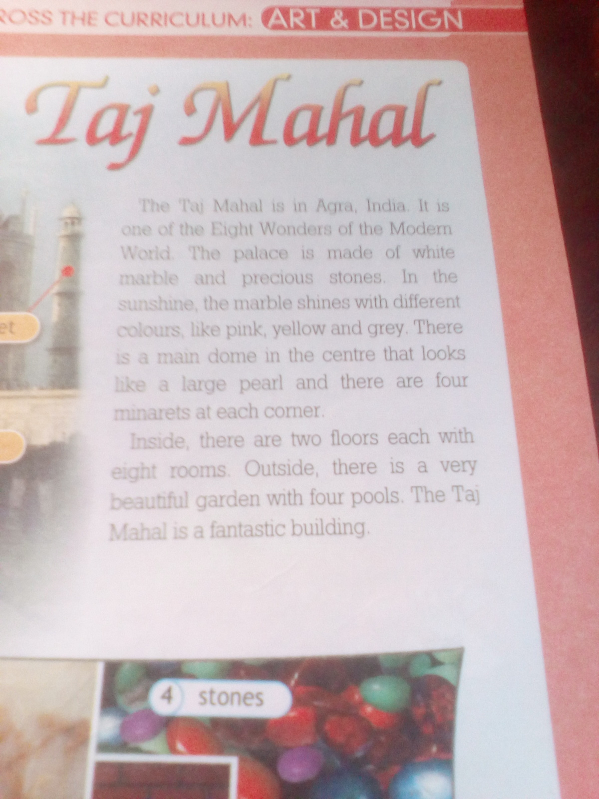 внутри 2 этажа и каждый в 8 комнатами. снаружи очень красивый сад с 4 бассейнами. Тадж-Махал это фантастическая постройка.