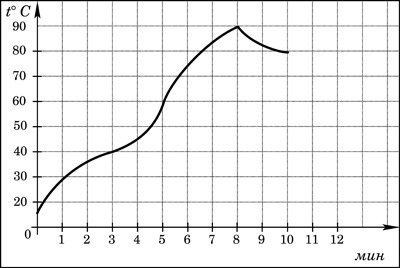 На графике показан процесс разогрева двигателя легкового автомобиля. На оси абсцисс откладывается время в минутах, прошедшее от запуска двигателя, на оси ординат — температура двигателя в градусах Цельсия. Определите по графику, на сколько градусов нагреется двигатель со второй по пятую минуту разогрева.