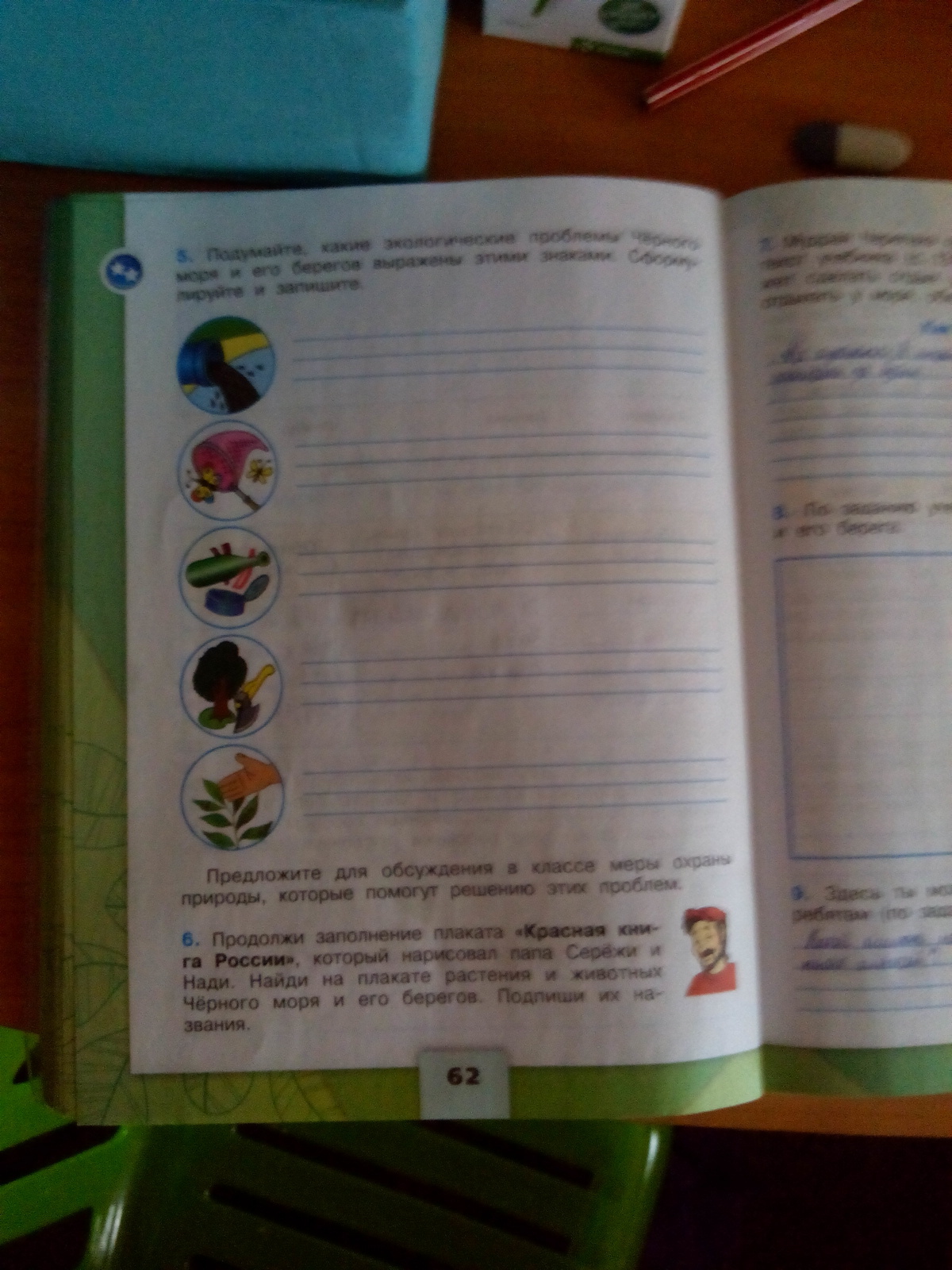 Подумайте, какие экологические проблемы Чёрного моря и его берегов выражены этими знаками. Сформулируйте и запишите.