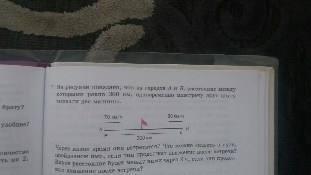 на рисунке показано что из города А и Б расстояние между которыми равно 300 километров одновременно навстречу друг другу выехали две машины через какое время они встретятся Какое расстояние будет между ними через 2 часа если они продолжат движение после встречи?