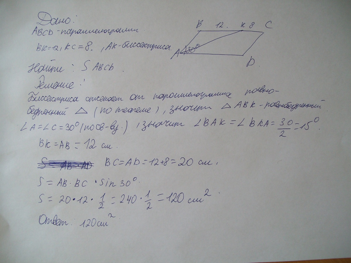 В параллелограмме бисектриса острого угла, который равен 30 градусов, делит его сторону на отрезки 12 и 8 см, начиная с вершины тупого угла. Найти площадь параллелограмма.