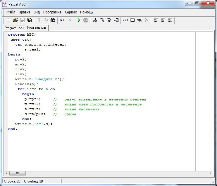 Написать прогрессию в ПО Pascal ABC!!!(пробовал сделать сам, допустил где-то ошибку(и)). При n=1 Pascal должен выдавать ответ 2, при n=2 Pascal должен выдавать 2,75, при n=3 Pascal должен выдавать ответ 3,125!!!