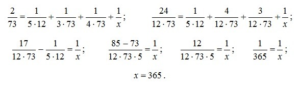 В папирусе Ринда (Древний Египет) среди прочих сведений содержатся разложения дробей в сумме дробей с числителем 1,например,2/73=1/60+1/219+1/292+1/х.Один из знаменателей здесь заменён буквой х. Найдите этот знаменатель.
