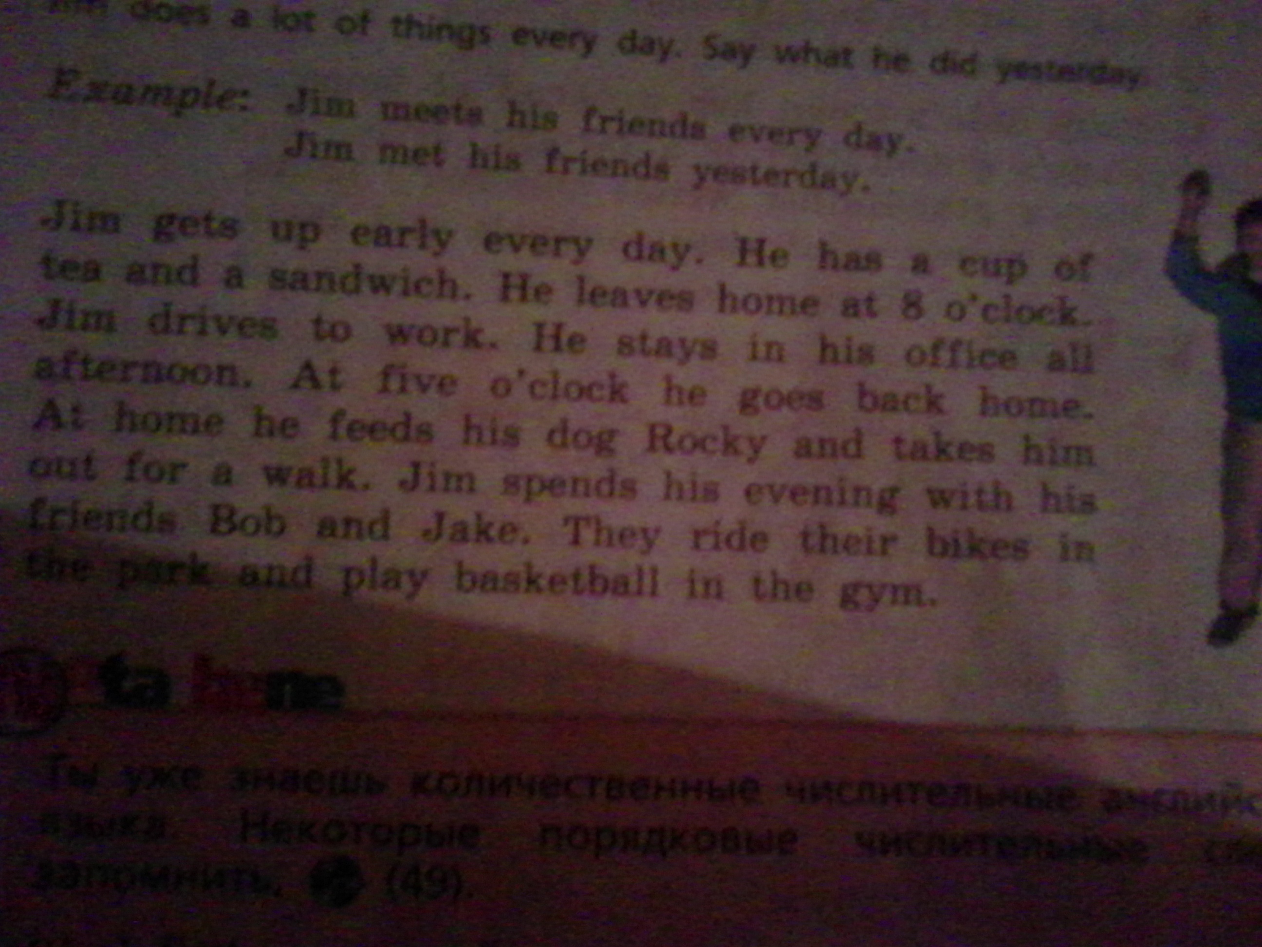 Jim got up early yesterday. He had a cup of tea an sandwich yesterday. Then He drove to work. He stayed in his office all afternoon. At 5 o'clock he went back home.at home he fed his dog and took him out for walk.jim spent his evening with friends