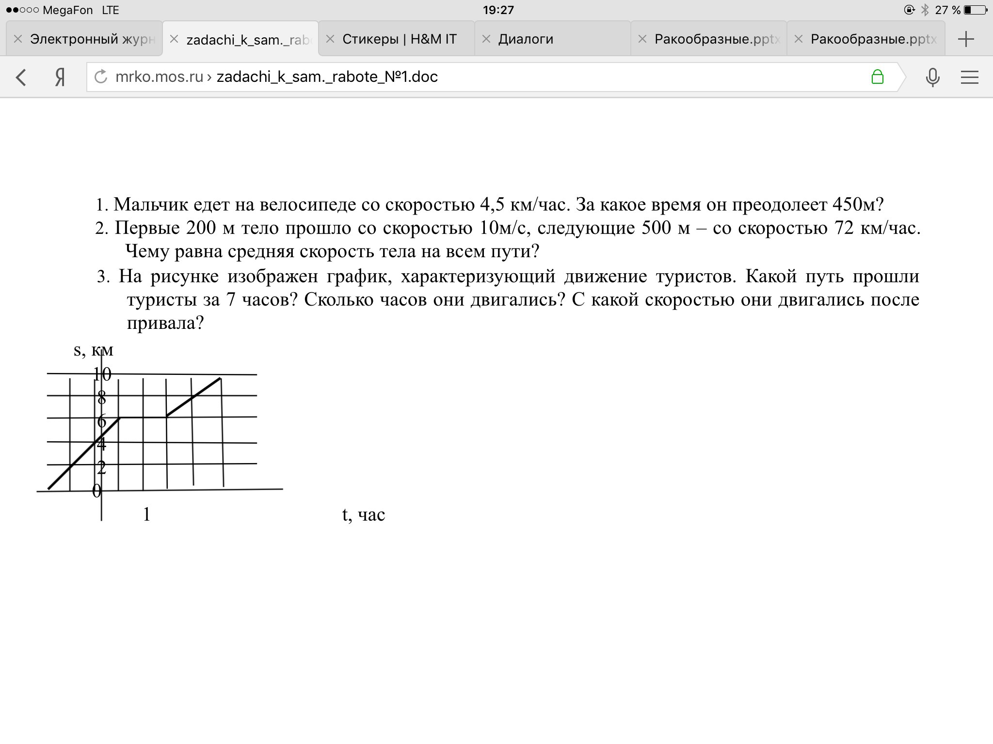 На рисунке изображен график, характеризующий движение туристов. Какой путь прошли туристы за 7 часов? Сколько часов они двигались? С какой скоростью они двигались после привала?