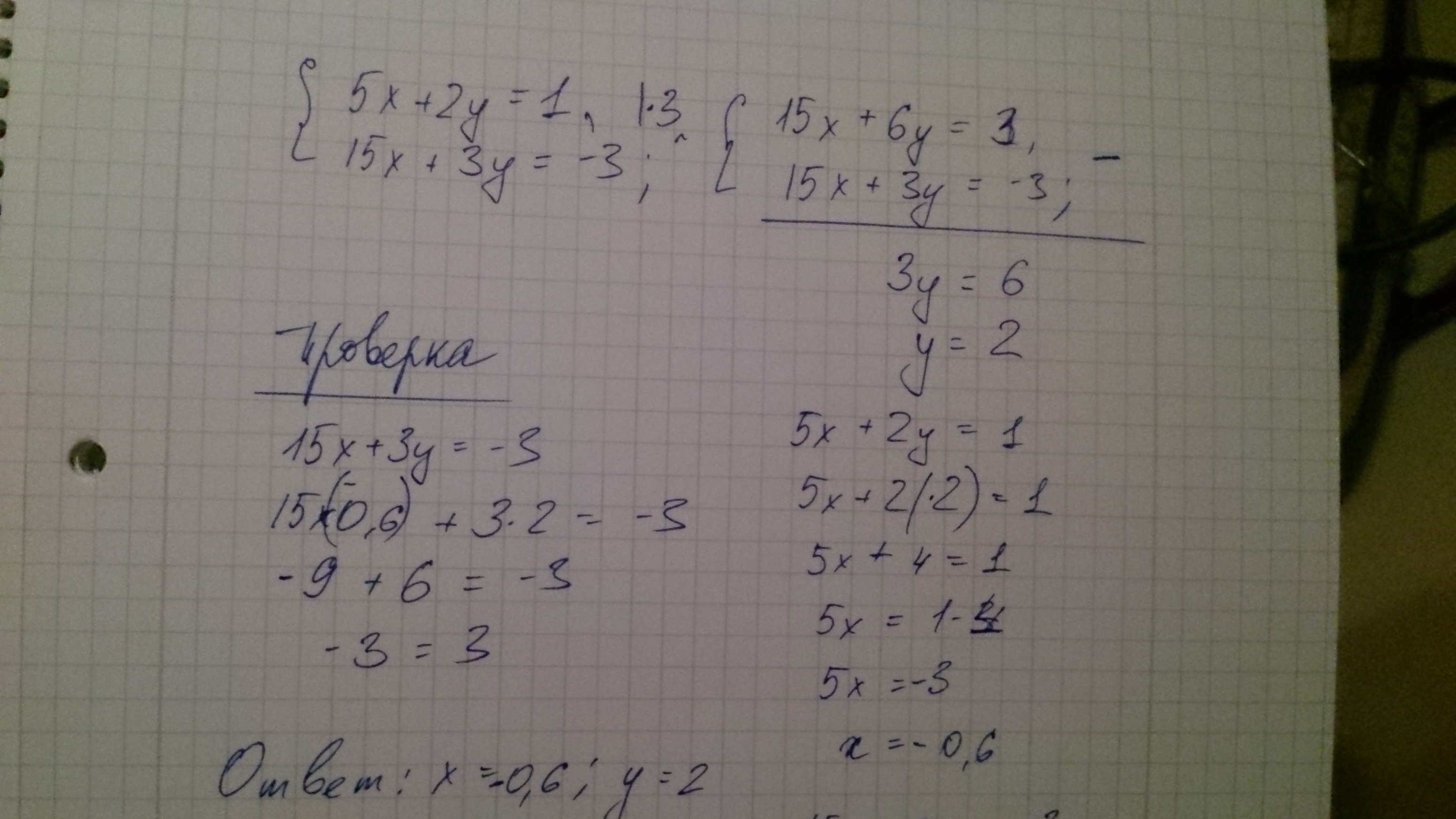 умножаем 1 уравнение на -3 и складываем: -15x-6y+15x+3y=-3-3; -3y=-6; y=2; 5x+4=1; 5x=-3; x=-0,6; Ответ: (-0,6;2)