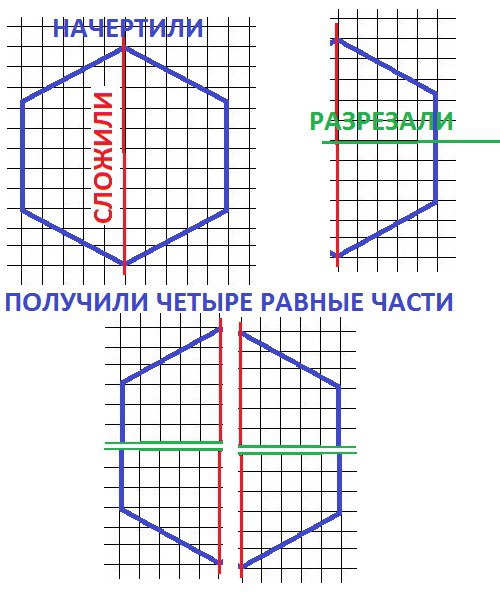 На клетчатой бумаге изобразите шестиугольник, который можно одним прямолинейным разрезом разделить на четыре равные части. Покажите, как проходит разрез. (Вершины шестиугольника должны располагаться в узлах сетки, но стороны и разрез не обязательно проводить по линиям).