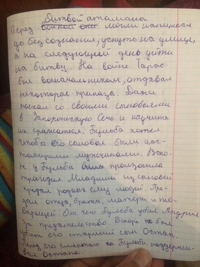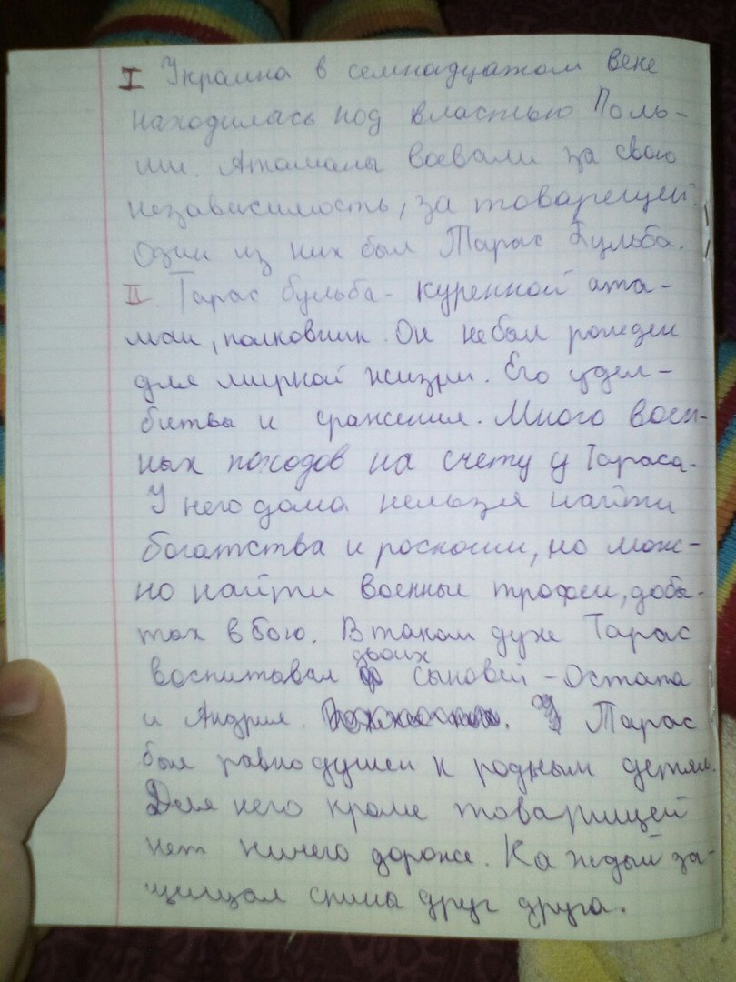 Н.В.Гоголь - гениальный писатель ,отразивший в своём творчестве многие проблемы своего времени .У него есть ряд романтических повестей и рассказов .Наиболее яркой является героическая повесть"Тарас Бульба",рассказывающая о борьбе украинского казачества за свою независимость .Главный герой повествования - куренной атаман ,полковник Тарас Бульба.Он не рожден был для тихой жизни .Его удел - битвы и сражения .Много военных походов на счету у Тараса .Если зайти в его дом ,то мы увидим ,что там нет богатства и роскоши ,зато много военных трофеев ,добытых в бою. Будучи сам героем ,в таком же духе Тарас воспитывал и сыновей -Остапа и Андрия .Достаточно вспомнить приём ,который он оказал вернувшимся с учёбы из бурсы сыновьям .Предложил побороться,чем привёл в ужас свою безответную жену .Ранним утром ,не дав сыновьям проститься с матерью ,Тарас увёз их в Запорожскую Сечь ,место ,где формировались характеры настоящих казаков .ОН гордился сыновьями .Оба красивые ,сильные ,отважные ,под стать герою - отцу .Но в одной из битв при осаде города бравый Андрий перешёл на сторону противника из - за женщины ,прекрасной полячки .Не могла стерпеть этого душа старого Тараса .Ведь именно он сказал речь о товариществе ,которую все сегодня помнят. "Нет уз святее товарищества! Отец любит своё дитя, мать любит своё дитя, дитя любит отца и мать. Но это не то, братцы: любит и зверь своё дитя. Но породниться родством по душе, а не по крови, может один только человек. " .Товарищество не приемлет предательства ,именно поэтому отец казнит своего сына ,не простив ему измены ."Я тебя породил ,я тебя и убью " Суровый век - суровые нравы .Но Тарасу суждено было потерять и второго сына ,своего верного соратника -Остапа .Он был схвачен и казнен на площади .Скрывающийся от погони Тарас Бульба пробрался но площадь и ответил на возглас сына ,поддержав его в трудную минуту .Тарас Бульба был самым уважаемым среди казаков ,но его не могли понять товарищи ,когда он стал после гибели Остапа мстить врагу без жалости и снисхождения .Мечом и огнём прошелся Тарас по вражеской земле .За ним устроили настоящую охоту .Не взяли бы опять ,да уронил казак свою люльку ( трубку ) и вернулся ,чтобы врагу не досталась .Напали на него 12 человек "Сила одолела силу"Но Тарас остался верен себе и товариществу ,сумел в последний раз послужить казакам .Распятый на дереве ,под которым разжигали костёр поляки ,чтобы живьём сжечь лютого врага .Но не о смерти думал Тарас .Он увидел челны ,стоящие у реки .Крикнул соратникам и тем спас их .Здесь Гоголь возвышает своего героя до былинного богатыря ,преодолевающего зычным голосом даже расстояния .Безусловно ,автор восхищается своим романтическим героем .Писатель обратился к романтизму ,работая над повестью в эпоху реакции и мракобесия,царящих в России .В реальной жизни он не видел образца для подражания и поэтому обратился к героическому прошлому .дав читателю такого героя ,как Тарас Бульба .