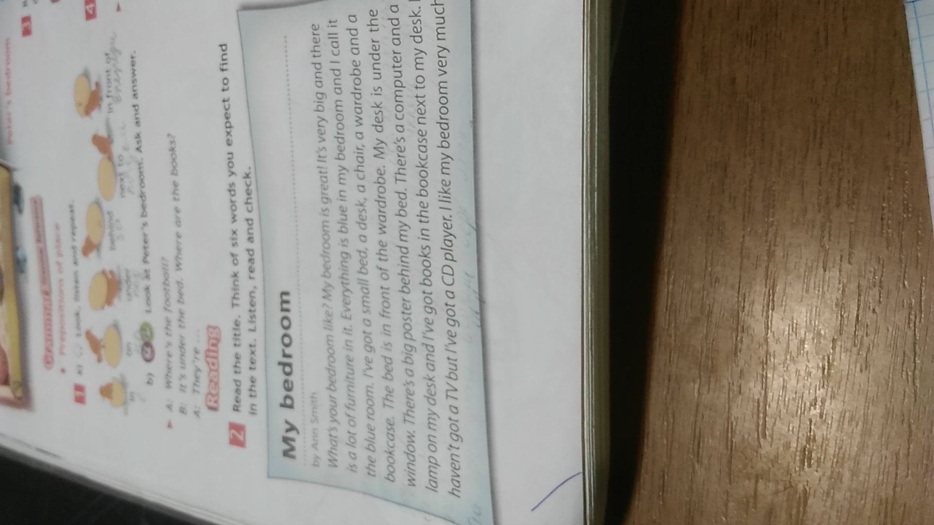Какова твоя спальня? Моя спальня замечательная! Она очень большая и в ней много мебели. В моей спальне всё синее и поэтому я называю ее синей комнатой. У меня есть небольшая кровать, стол, стул, шкаф для одежды и книжный шкаф. Кровать находится перед шкафом. Мой стол стоит под окном. Позади моей кровати большой постер. На моем столе стоит компьютер и лампа, книги у меня в книжном шкафу, рядом со столом. У меня нет телевизора, но есть CD плеер. Мне очень нравится моя спальня.