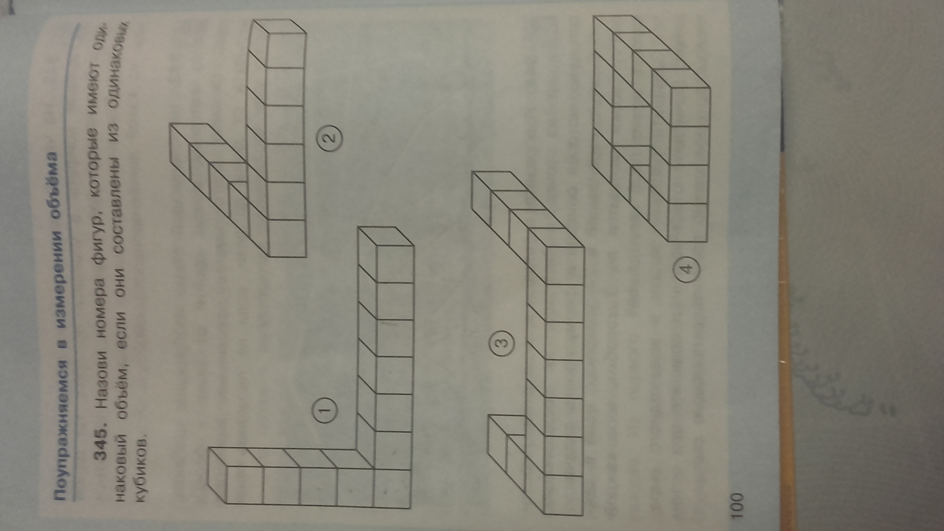 3 и 4 фигуры имеют по 12 кубов. Если их объем каждого куба равен, значит и объем этих фигур равен.