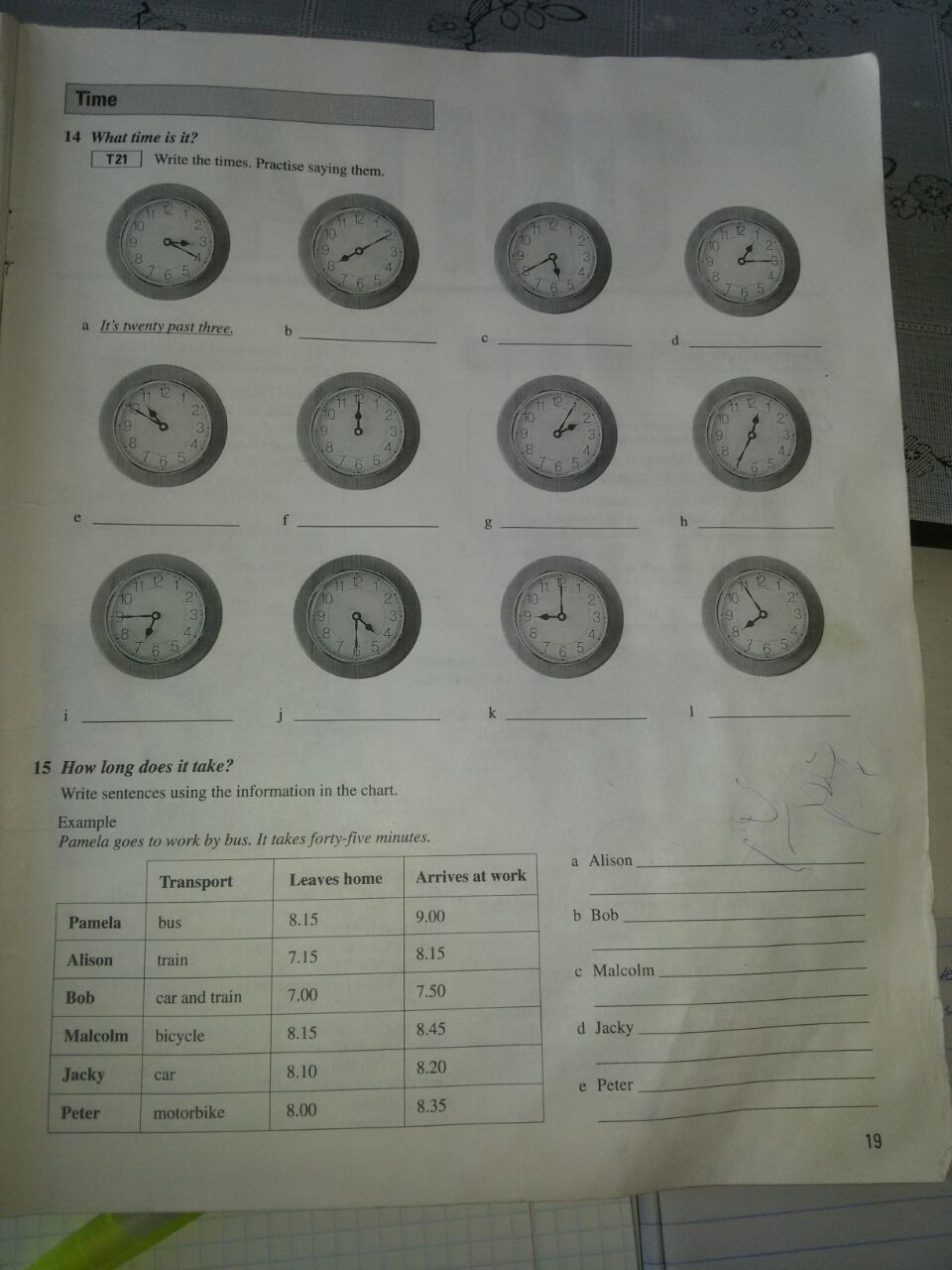 Alison goes to work by train. It takes an hour Bob goes to work by car and train.It takes fifty minutesMalcolm goes to work by bicycle.it takes half an hourJacky goes to work by car. It takes ten minutesPeter goes to work by motorbike. It takes thirty five minutes