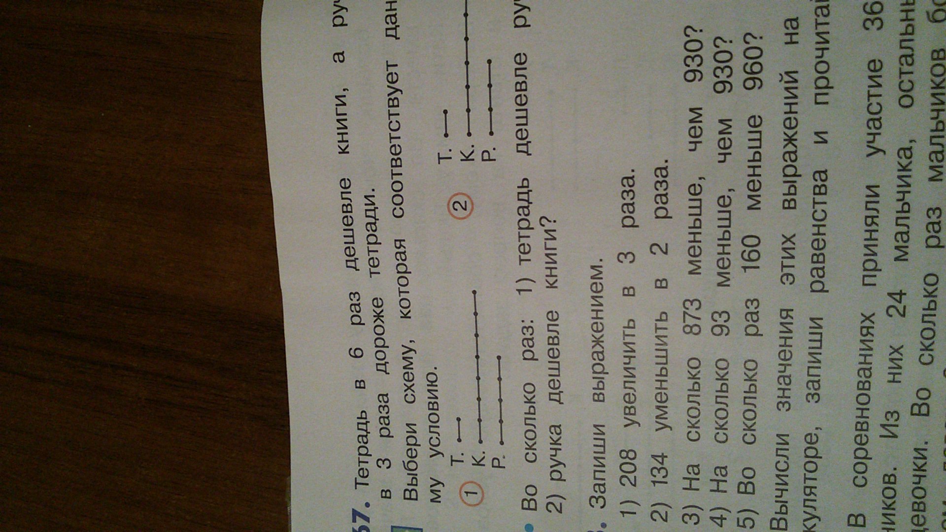 тетрадь в 6 раз дешевле книги ,а ручка в 3 раза дороже тетради . выбери схему .которая соответвутствует данноему условию.