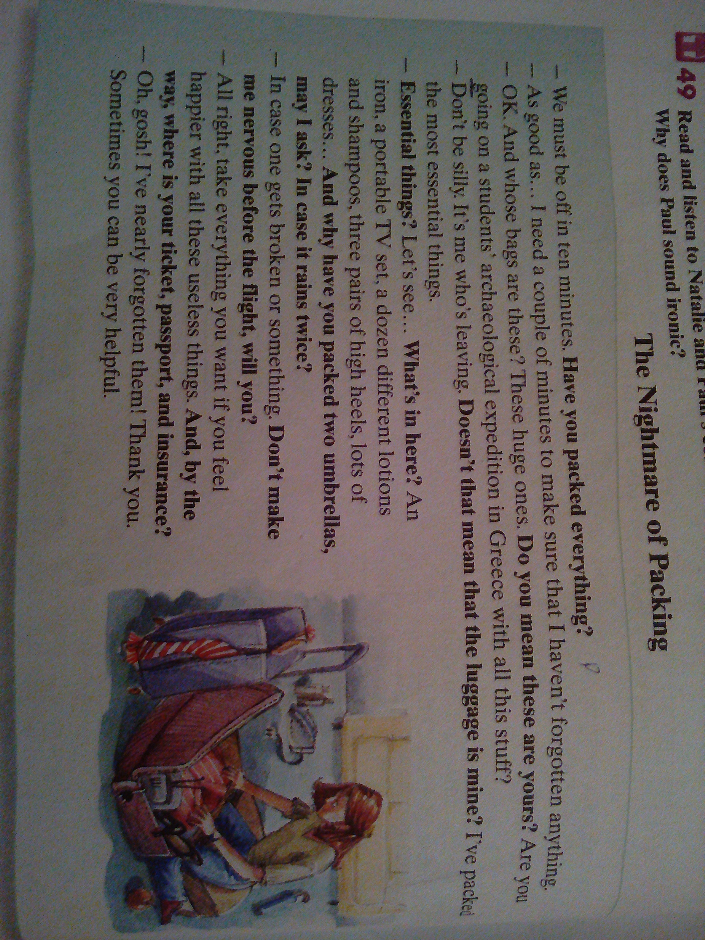 Оф минутс ту мэйк сюр зэт ай хэвент форготен энисинг.ок энд зоуз бэгс ар зис?зис хиюч ванс.ду ю мин зис ар ёрс?ар ю гоин он э стюдентс археолоджикал экпедишион ин грис вив ол зис стаф?