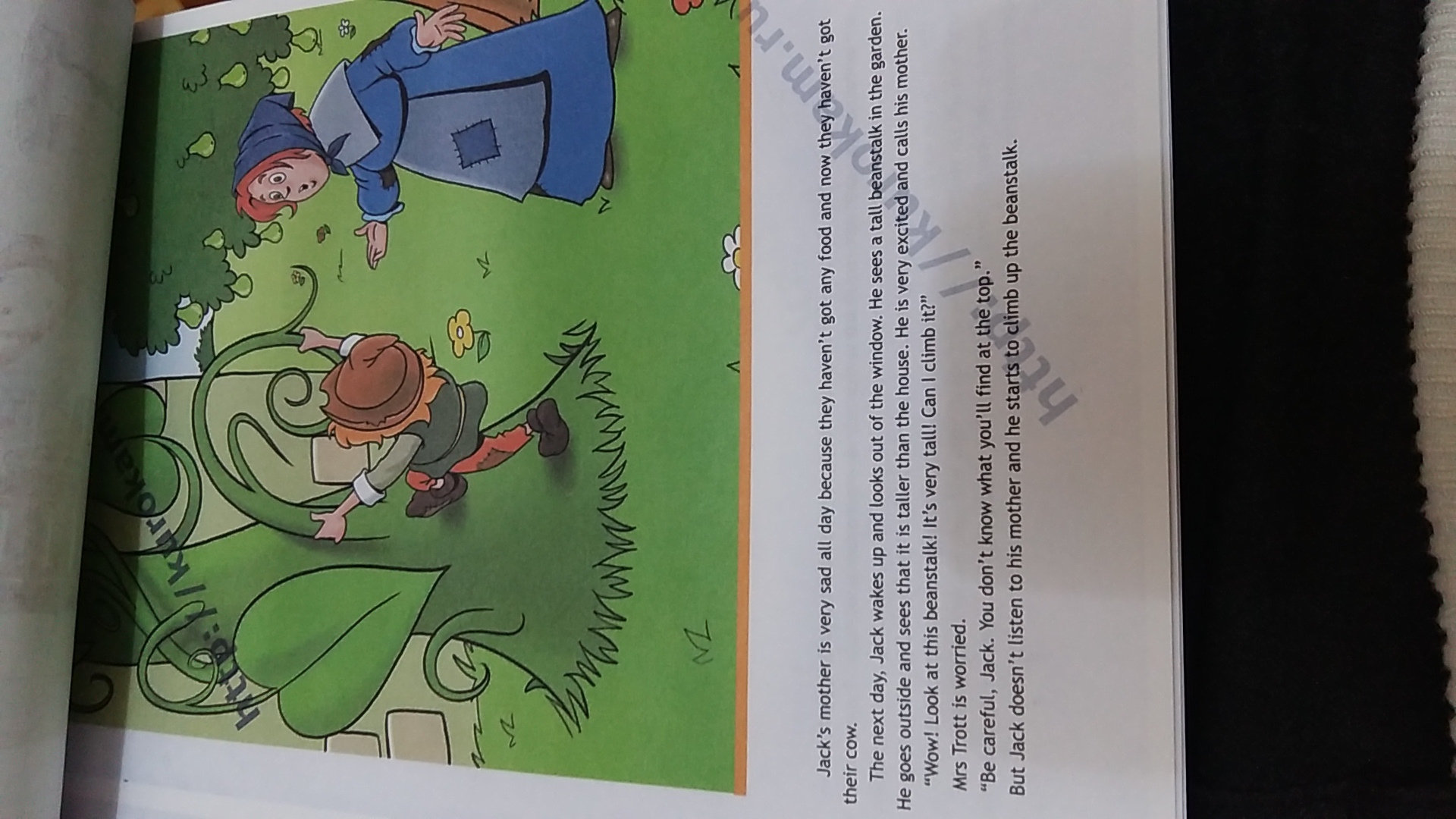 Мама Джека очень печальна весь день потому что у них нет ни еды ни коровы. На следующий день Джек встает и выглядывает в окно. Он видит высокое бобовое дерево в саду. Он выходит на улицу и видит что оно выше чем дом. Он очень удивлен и зовет свою маму.