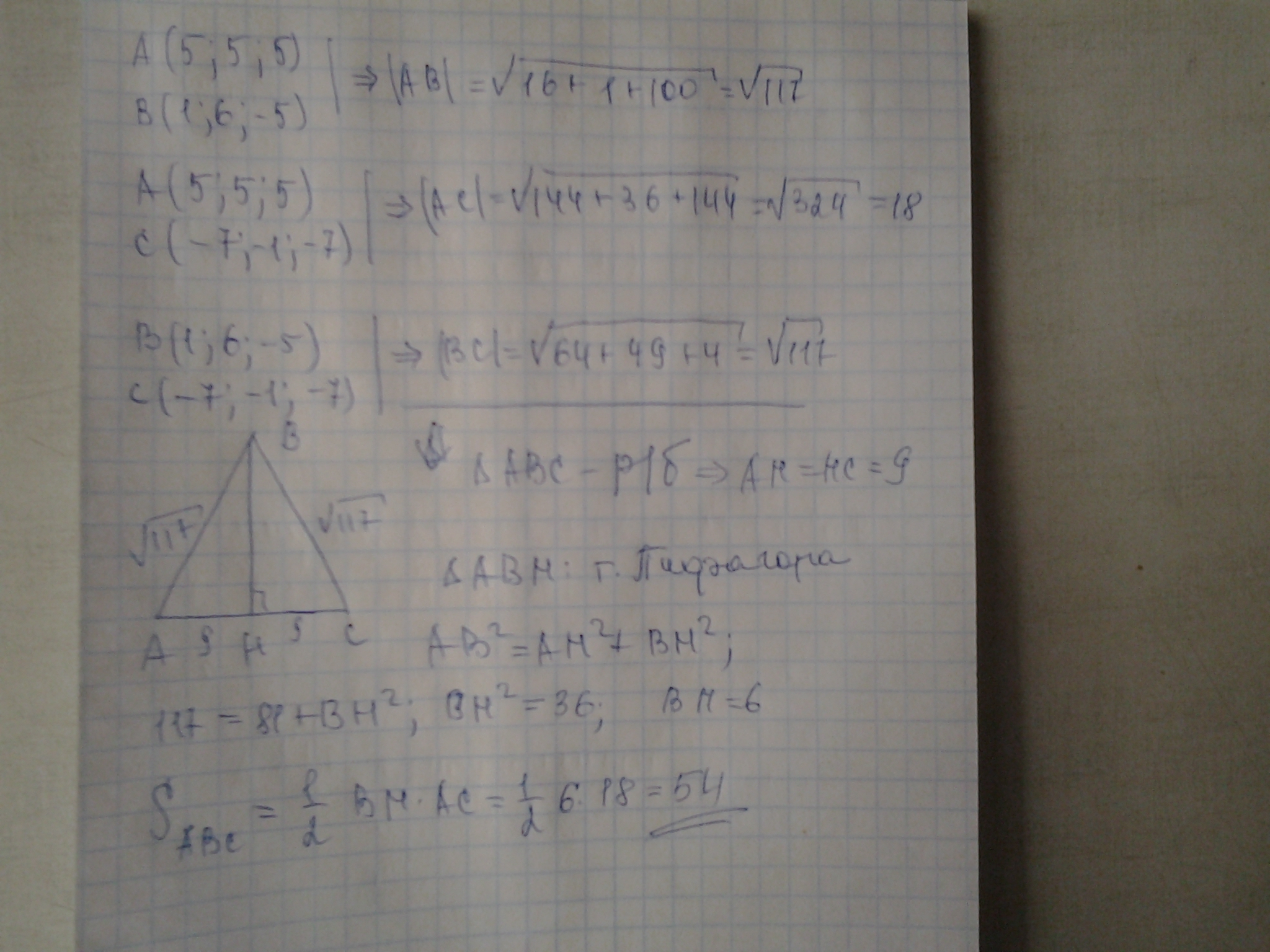 Применены : формула длины отрезка через координаты его концов, свойства равнобедренного треугольника, теорема Пифагора, формула площади треугольника
