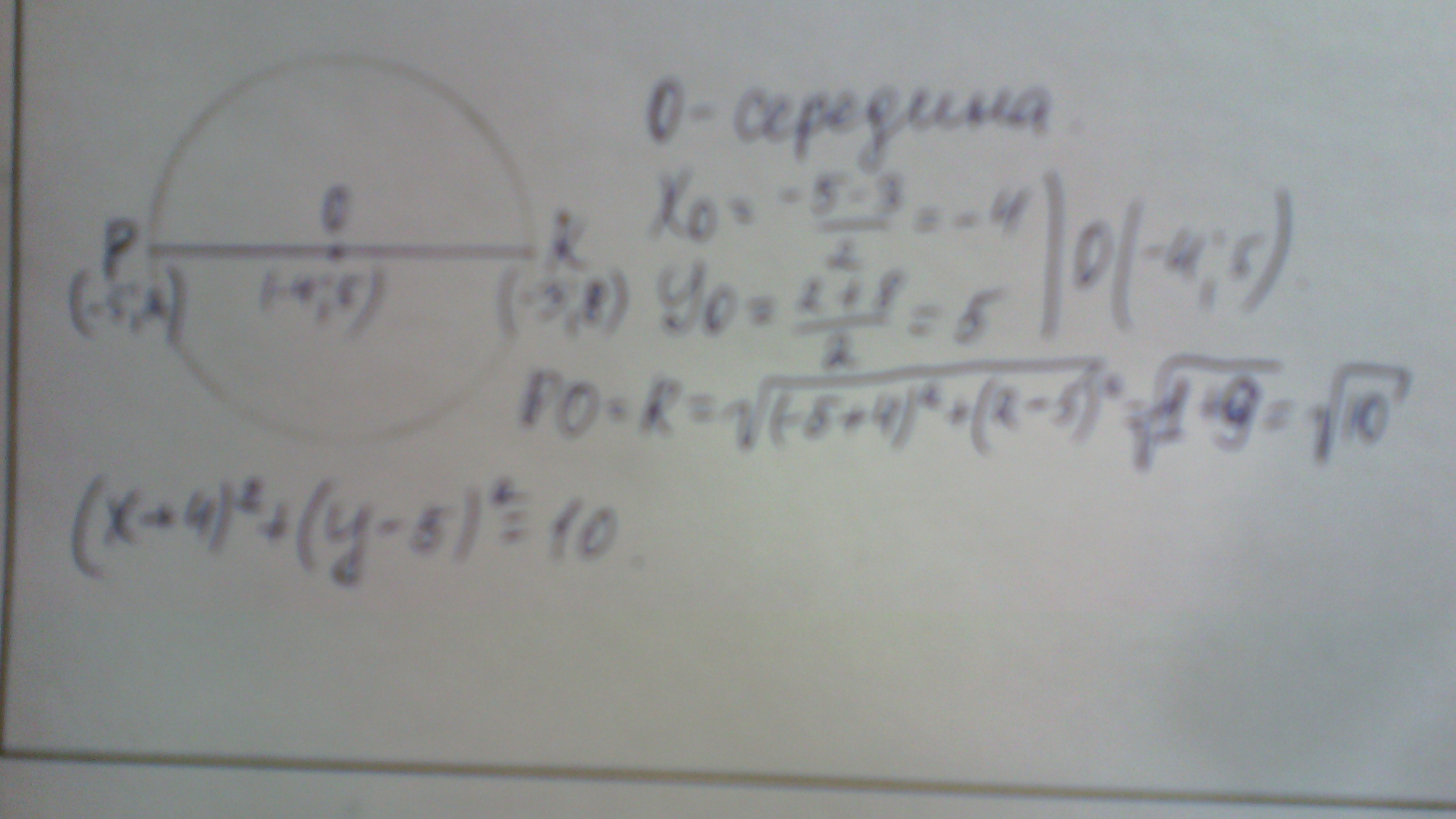 P(-5;2) К (-3;8) концы диаметра окружности. Найдите координаты ее центра,радиус и составьте уравнение окружности