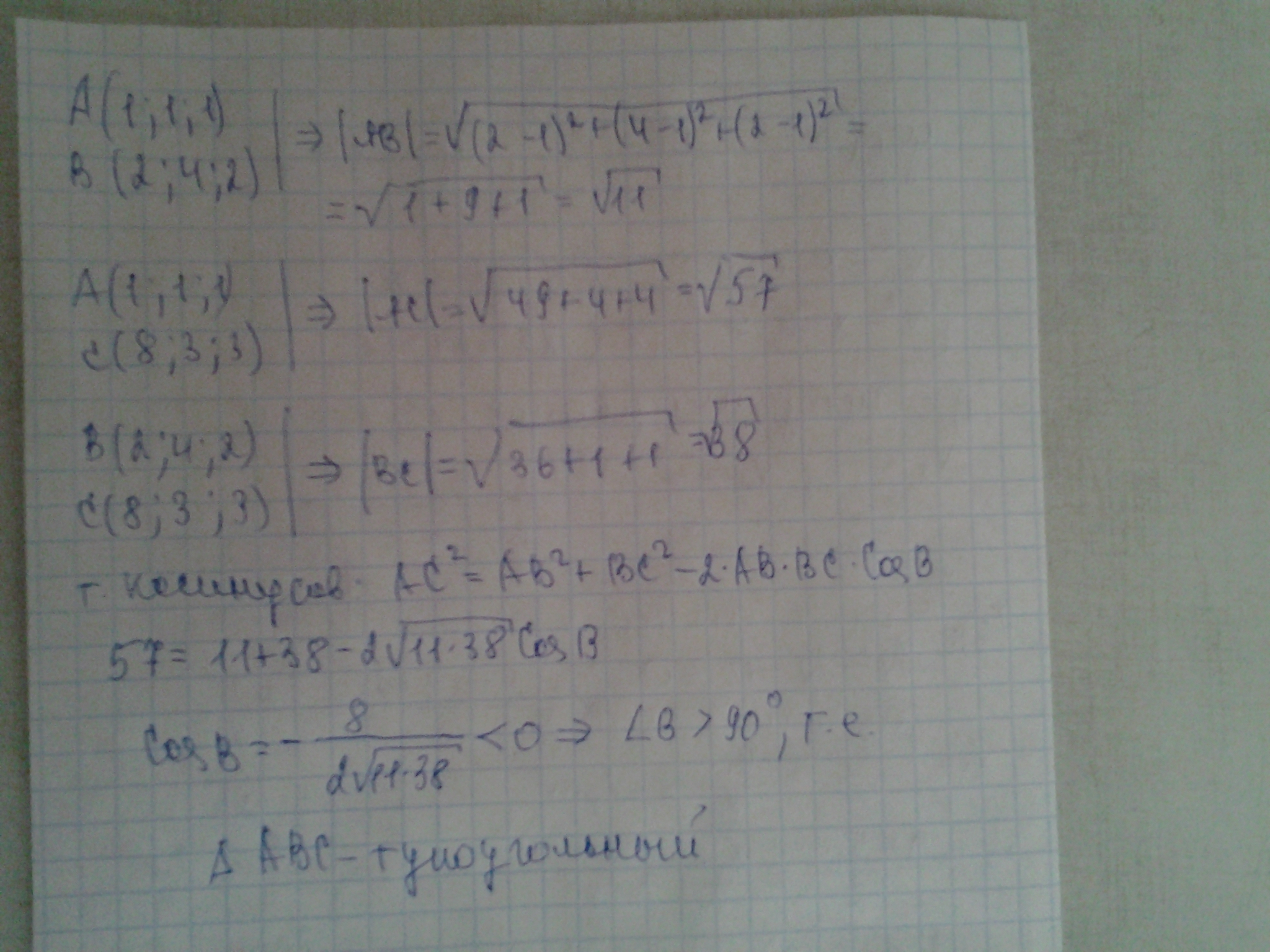 Применены : формула длины отрезка через координаты его концов, теорема косинусов
