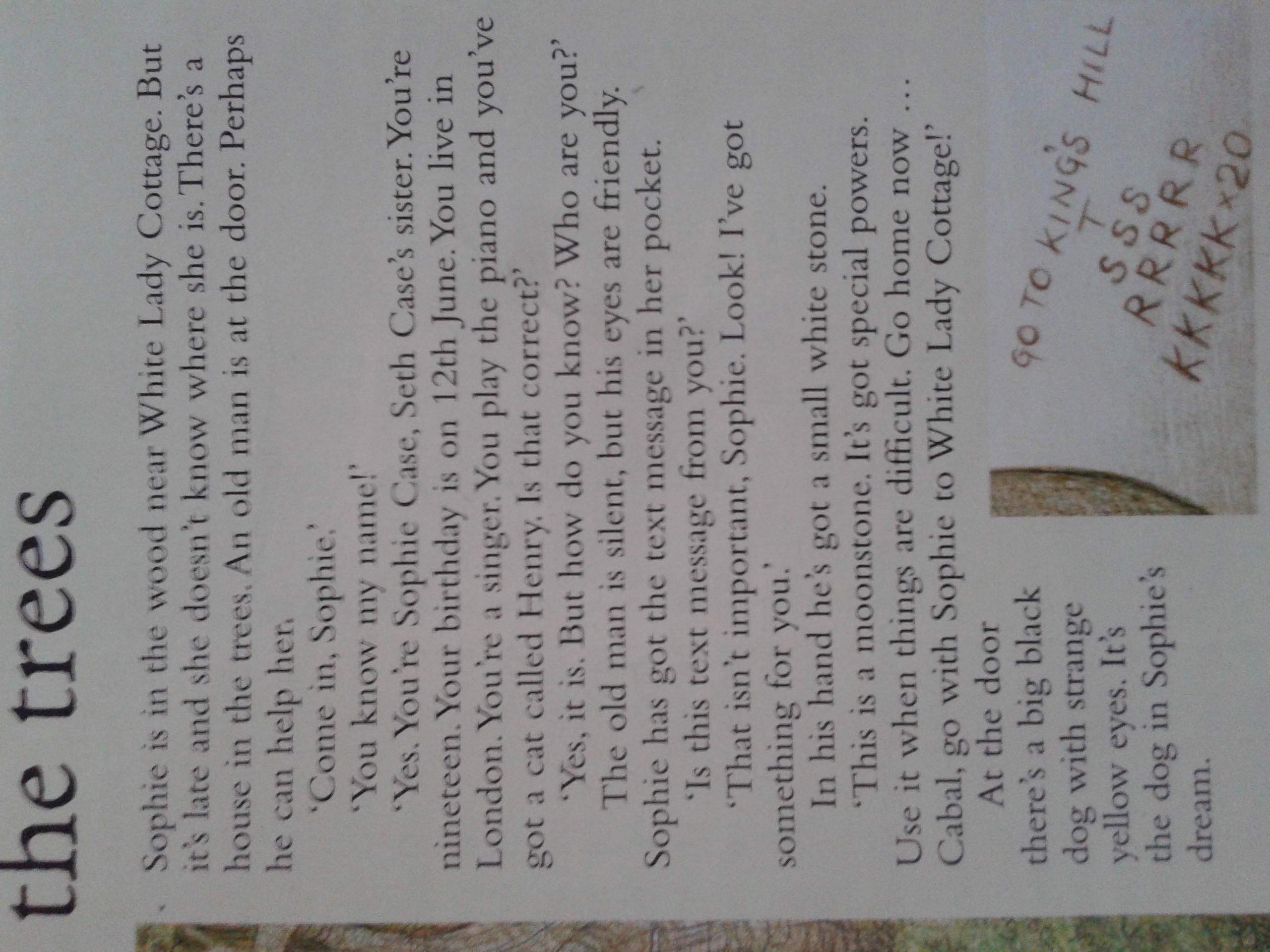 "Это лунный камень. У него особенная сила. Используй его когда будет трудно. иди домой сейчас.. Кабал, иди с Софи к Коттеджу Белая Леди!"