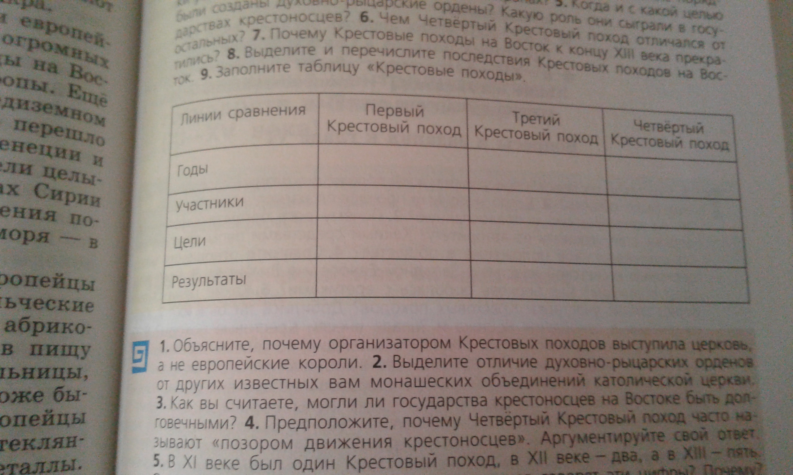 Первый крестовый поход. Годы :1095 году. Участники: Бедные рыцари. Люди, которые хотели прославится, беднота, которая не нужна была в городах.Цели :Освободить гроб господней от мусульман. Результаты: основание Иерусальимского королевства. Второй крестовый поход: Годы: 1147-1149 Участники: те же, что и в первом походе Цели : уничтожение Византийского правления. Результаты: Неудача похода. Разгром Христианской Армии. Третий Крестовый поход Годы : 1189-1192. был организован римскими папами Климентом и Григорием. Участники: Ричард Львиное сердце. Филипп Французский. Леапольд Австрийский. Фридрих Барбаросса. Цели : взятие Иерусалима. Освобождение гроба господние. Слава. Результаты: война с армией Саладина. Захват Иерусалима Саладином. Четвертый крестовый поход Годы: 1202-1204 Участники : армия Бонифация Монферрата Цели: Доставить корабли к Святой земле ( обещание венецианцев) Результаты: Разгром Константинопля.