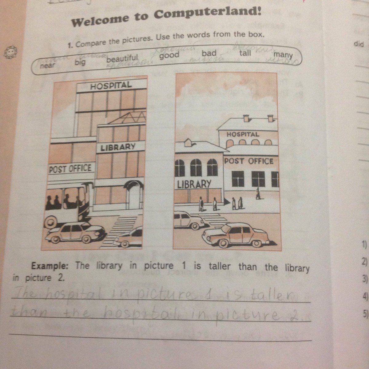 The library in picture number 1 is more beautiful than in picture number 2. People in picture 1 are much more than in picture 2. Crosswalk in picture 2 is near to library than in picture number 1. The post office in picture number 2 is worse than in picture number 1.