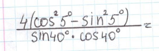 4(сos²5-sin²5)/(sin40*cos40)=4cos10/(0,5sin80)=2cos10/(sin90-10)=
