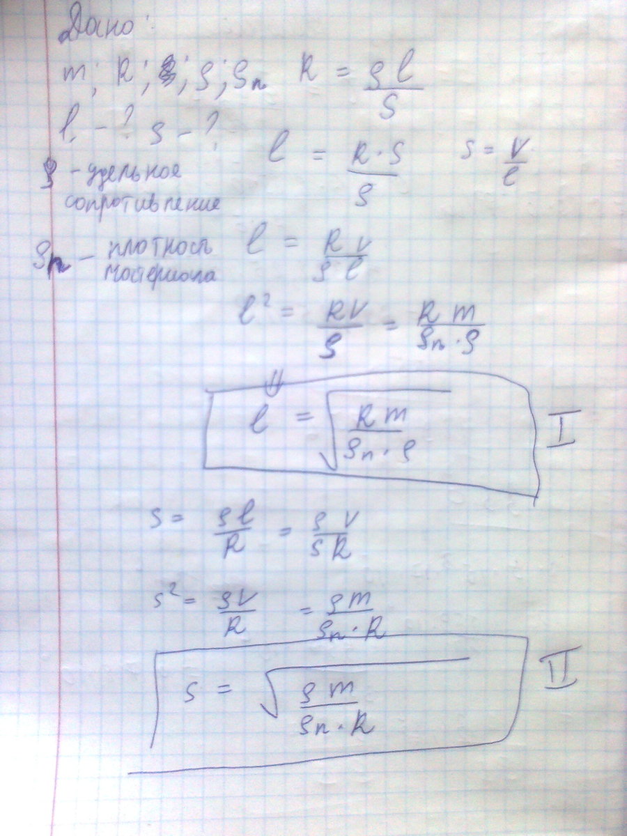 Моток проволоки, изготовленный из материалов, указанных в таблице, имеет сопротивление R и массу m. Найти длину l проволоки и площадь поперечного сечения S. Табл. во вложениях.