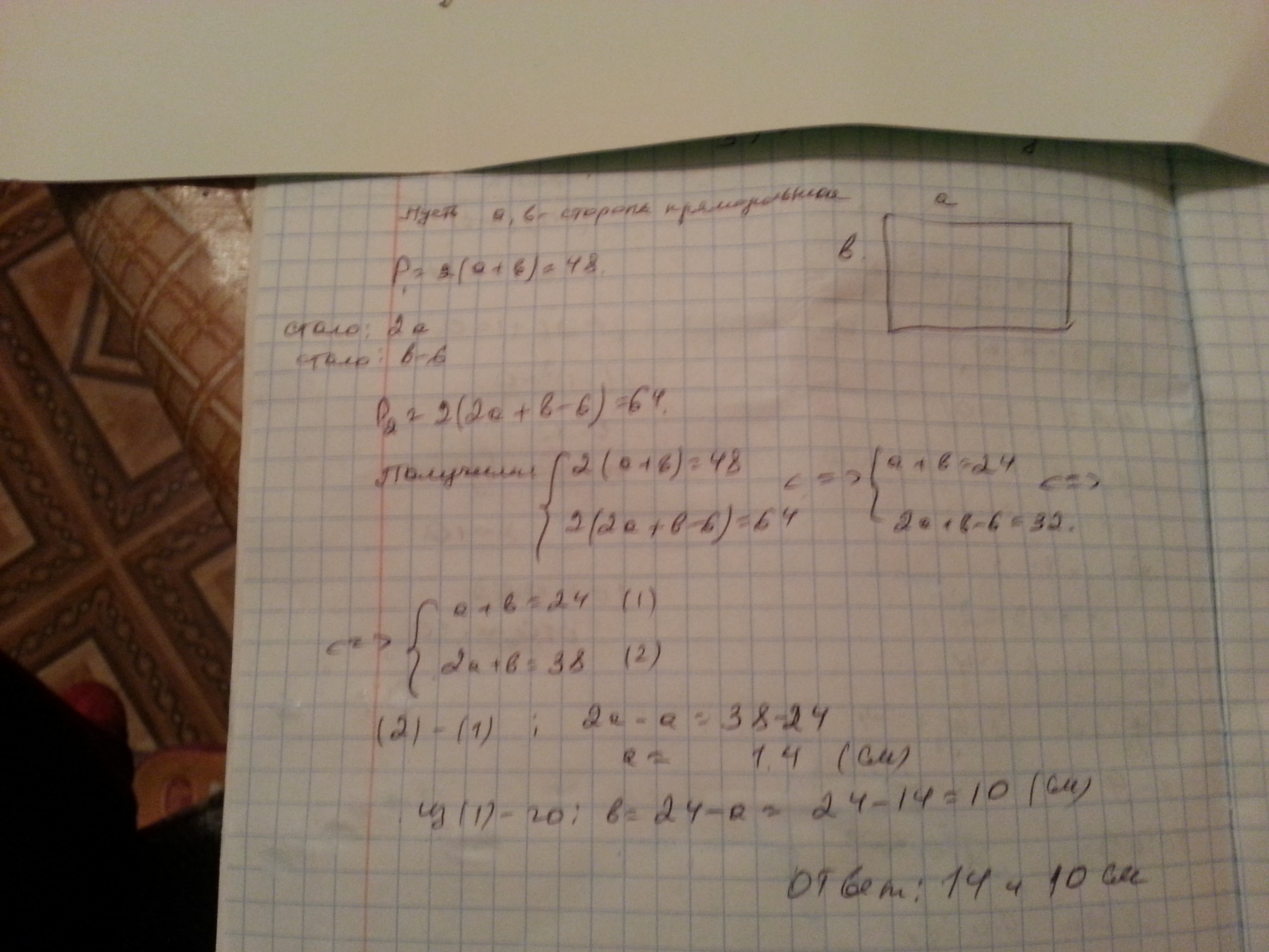 периметр прямоугольника равен 48 см если одну его сторону увеличить в 2 раза , а другую уменьшить на 6см то равен 64 см. найдите стороны данного прямоуголбника