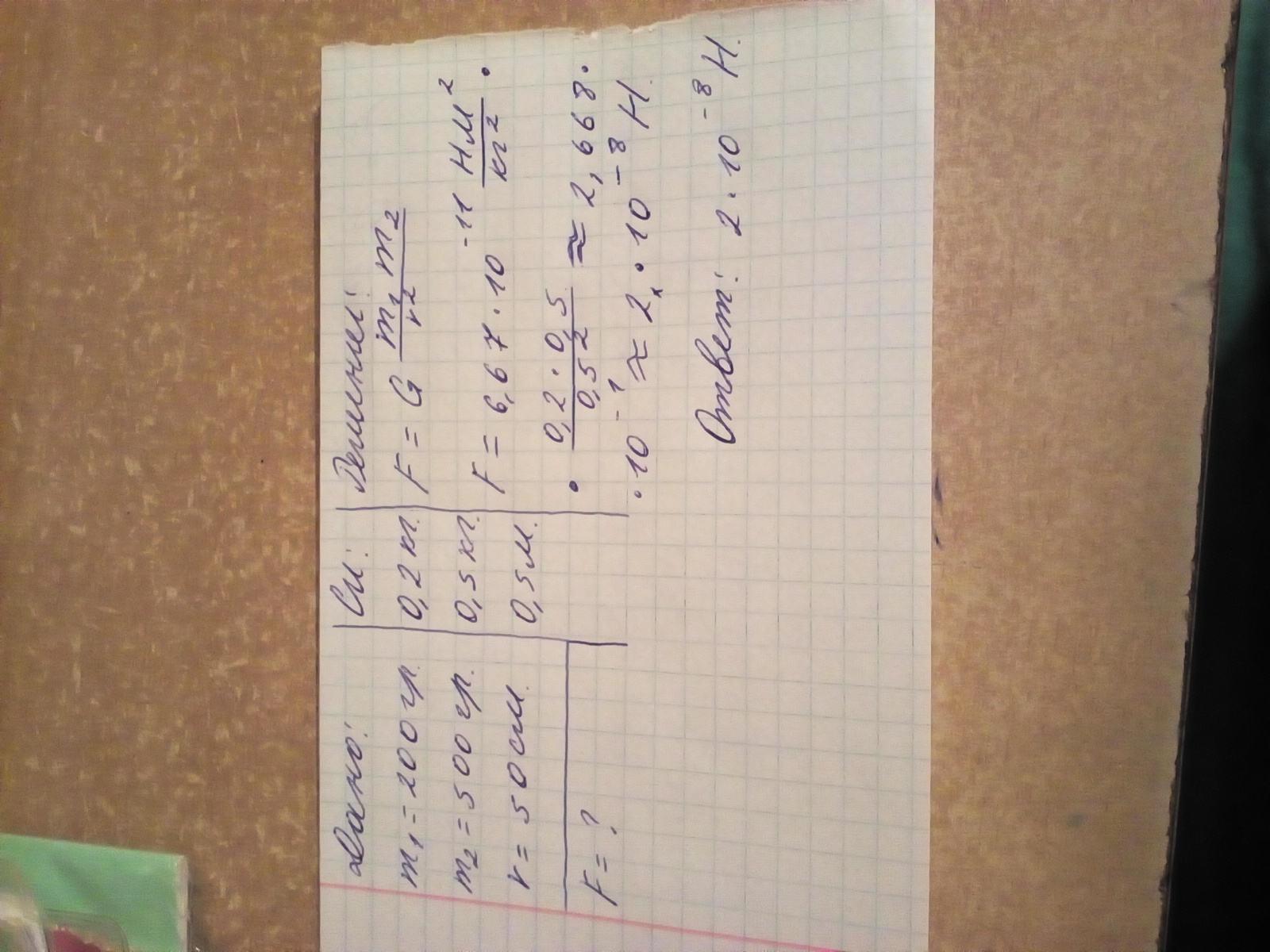 Помогите решить задачу Дано- m1=200 грамм m2=500 грамм. r=50 см. Найти F-всемирного тяготения. Помогите прошу.
