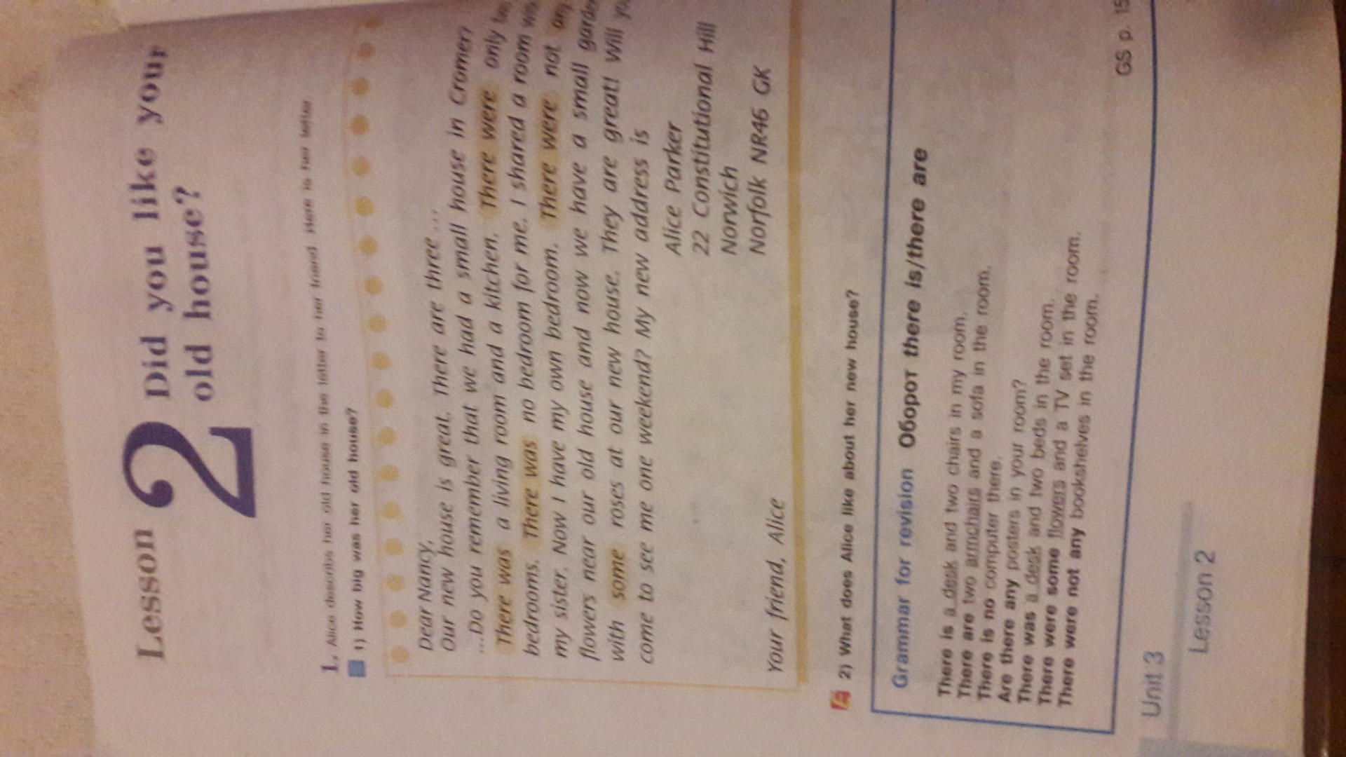Там была гостиная и кухня. Там были только две спальни. Спальни для меня не было. Я делила комнату со своей сестрой. Теперь у меня есть своя спальня. Около нашего старого дома не было цветов а теперь у нас есть маленький сад с несколькими розами в нашем новом доме. Они великолепны! Ты приедешь увидеться со мной на выходные ? Мой новый адрес Алис Паркер, 22 Конститушионал Хилл, Норвич Норфолк НР46 ГЛ. Твоя подруга, Элис