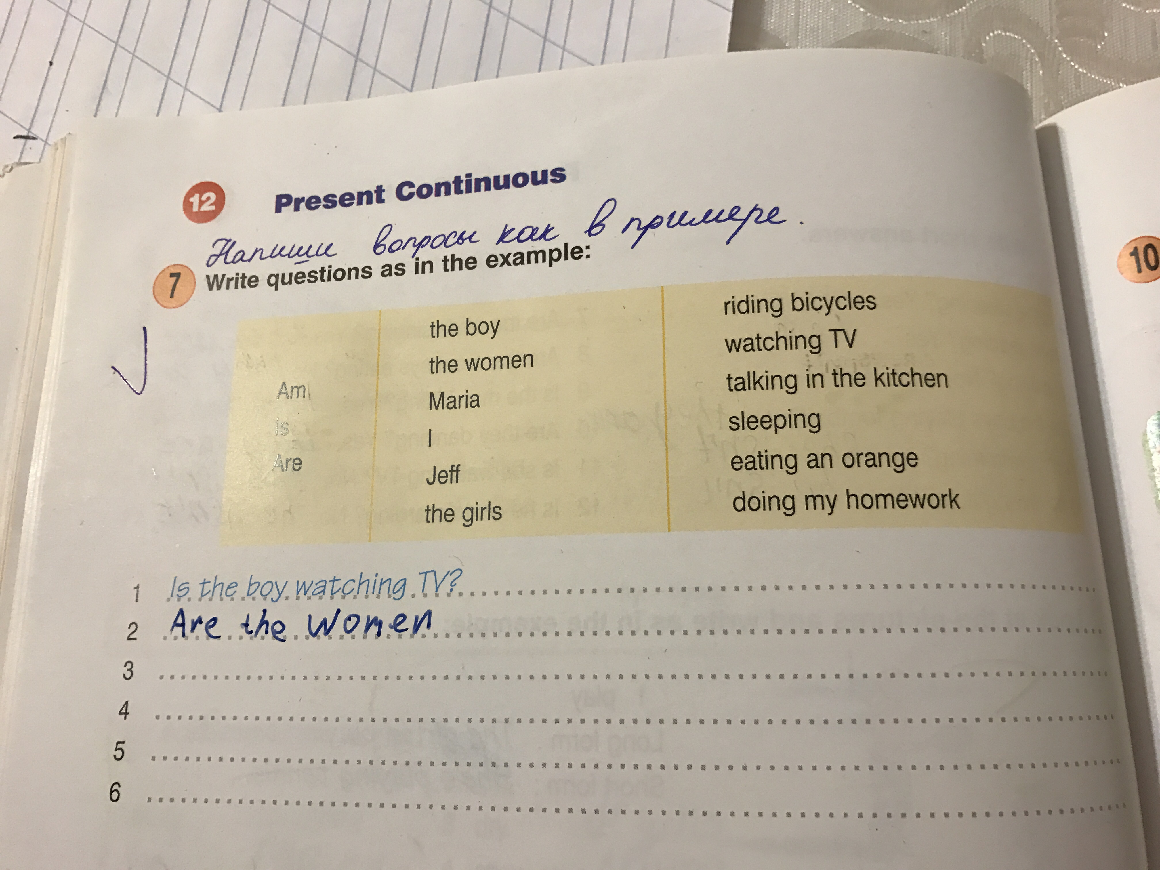 Am l doing my homework. Are the girls riding bicycles. Is Maria sleeping. Are the women talking in the kitchen. Is Jeff eating an orange. Is the boy wathing TV.