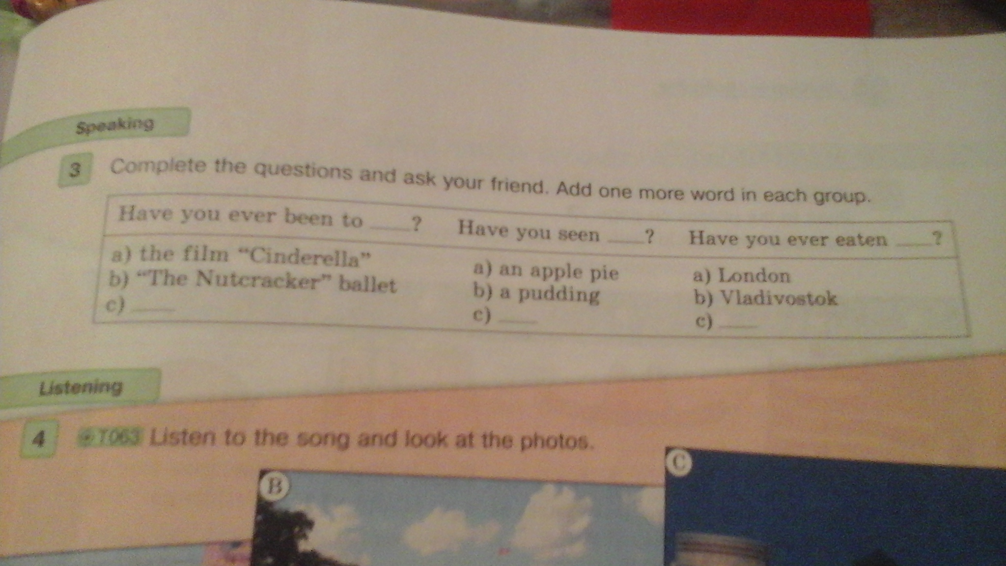 Have you ever been to London/Vladivostok/Moscow? Have you seen the film "Cinderella"/"The Nutcracker" ballet/me yeasteday? Have you ever eaten an apple pie/a pudding/a pizza?