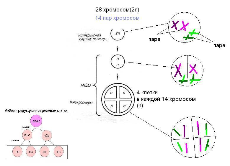 И даже если все пары будут кроссоверными, все равно будет 4 типа микроспор. Потому что 28 штук хромосомный набор одной клетки (2n), каждая пара отдаст по хроматиде в каждую из 4хклеток., то есть из одной клетки 2n,образуется 4 клетки nc