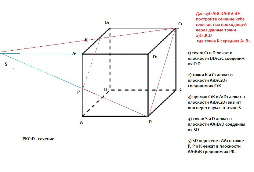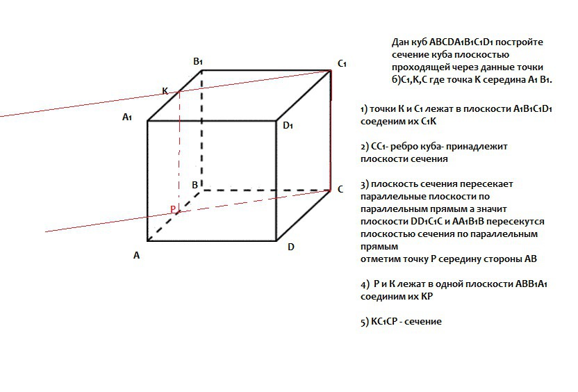 Дан куб ABCDA1B1C1D1 постройте сечение куба плоскостью проходящей через данные точки a)C1,K,D б)C1,K,C где точка K середина A1 B1.