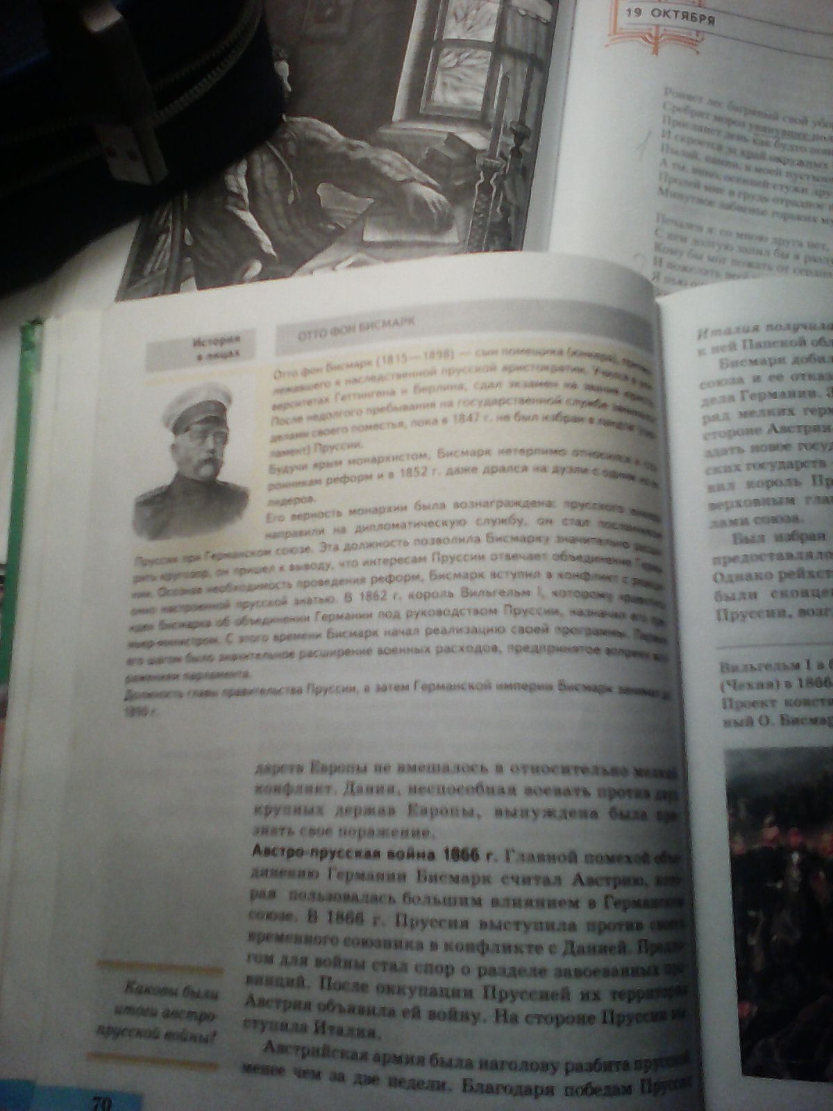 Бисмарк призывал к воссоединению германии призывал проявиться Германии на мировой арене он хотел поднять свою страну и т. д. посмотри в учебнике Загладина на 7о стр.